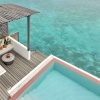 Расположены на сваях над водой, спальня с двуспальной кроватью king-size, отдельная гостиная комната с диваном, гардеробная, ванная комната с ванной, душем, внутренним двориком и душем под открытым небом, гостевой туалет, терраса с частным бассейном размером 7х3,5х1,2 м, душ на террасе, меблированная терраса на крыше, прямой спуск в воду, панорамный вид на океан, см.план номера, план террасы на крыше;