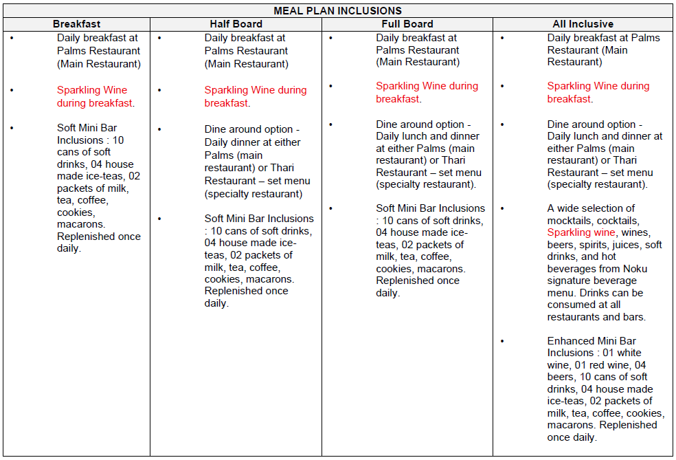 В номерах: Wi-Fi, бесплатный мини-бар с безалкогольными напитками, холодным чаем и сладкими угощениями (ежедневное пополнение), бесплатная фруктовая тарелка и свежий кокос при заезде, шкаф, пляжная сумка, халат, зонт, тапочки и шлёпанцы, сейф, кондиционер, мобильный телефон для связи с батлером выдаётся по прибытии, bluetooth колонка в вилле, банные принадлежности, полка для багажа.