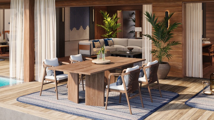 К услугам гостей – 38 вилл на пляже и на воде, рестораны, бар и винный лаундж, разнообразные развлечения: водные виды спорта, мастер-классы, дегустации, киносеансы и многое другое.