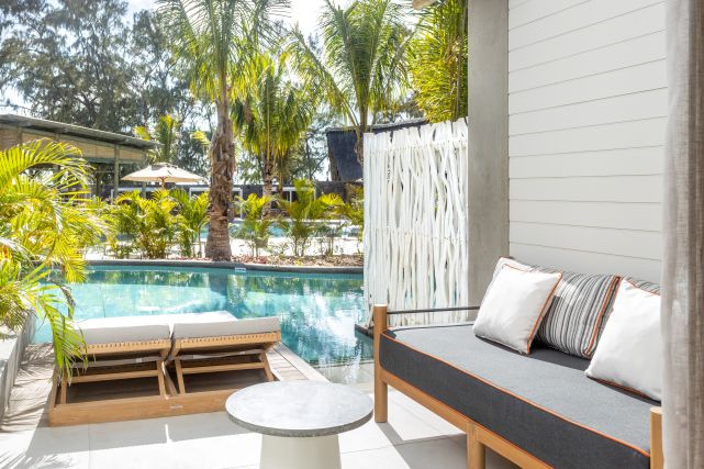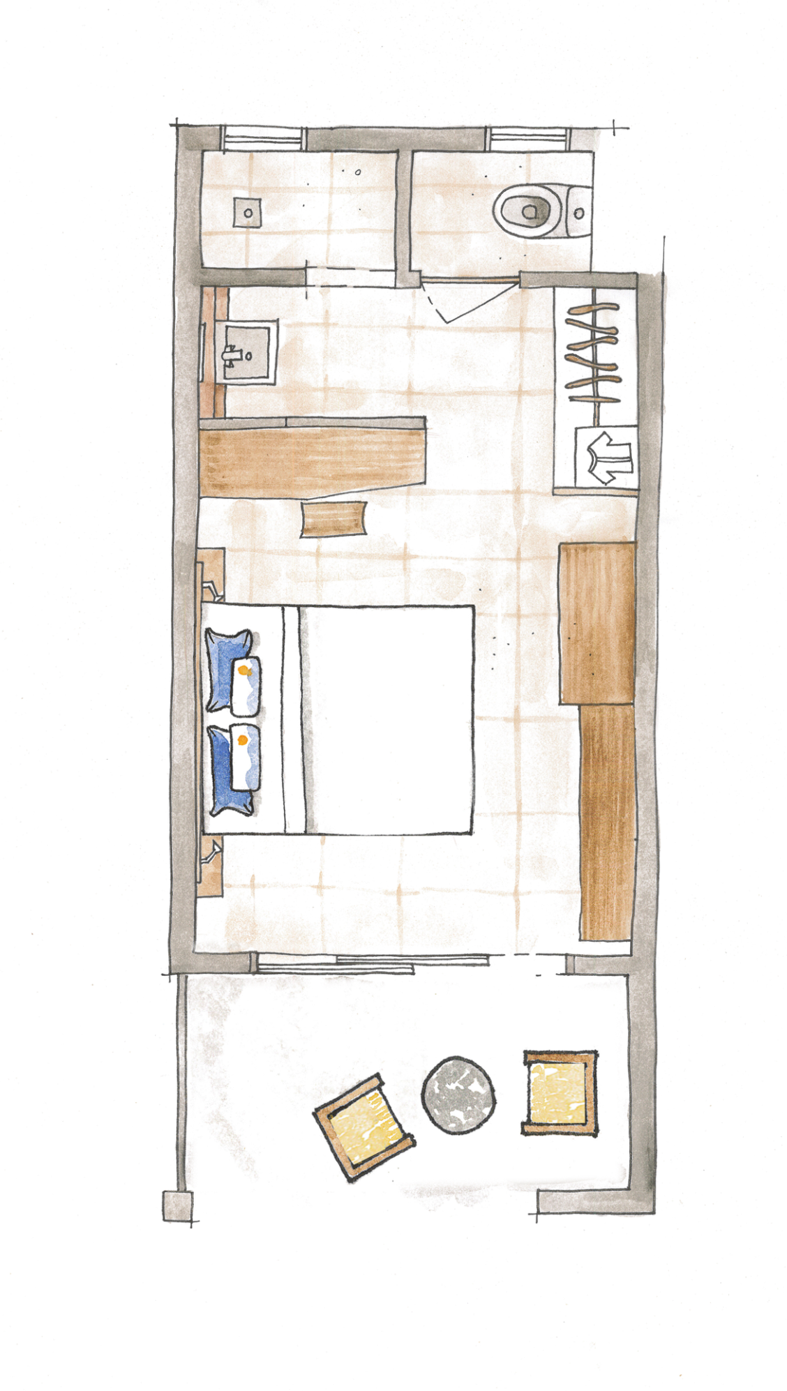 Двуспальная кровать, ванная комната с душем, меблированная терраса, частный садик и небольшой персональный бассейн, см. план номера. Размер матраса: 180 × 200 см.