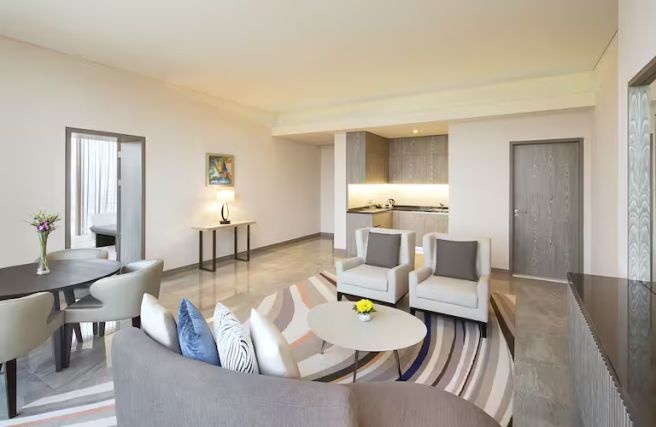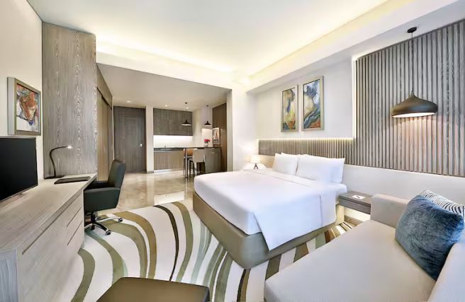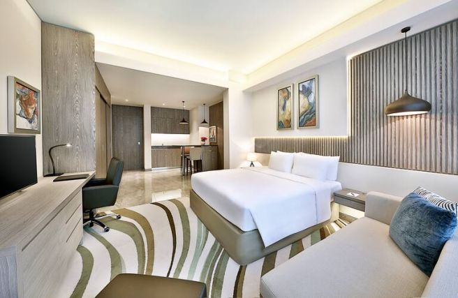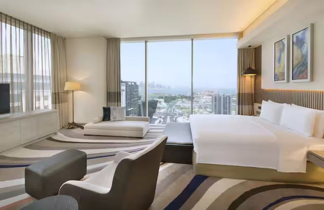 Отель предлагает стильные номера с современными удобствами, панорамными видами на город или Аравийский залив, бассейн на крыше, сауну, фитнес-центр и фирменное печенье DoubleTree Cookie при заселении.