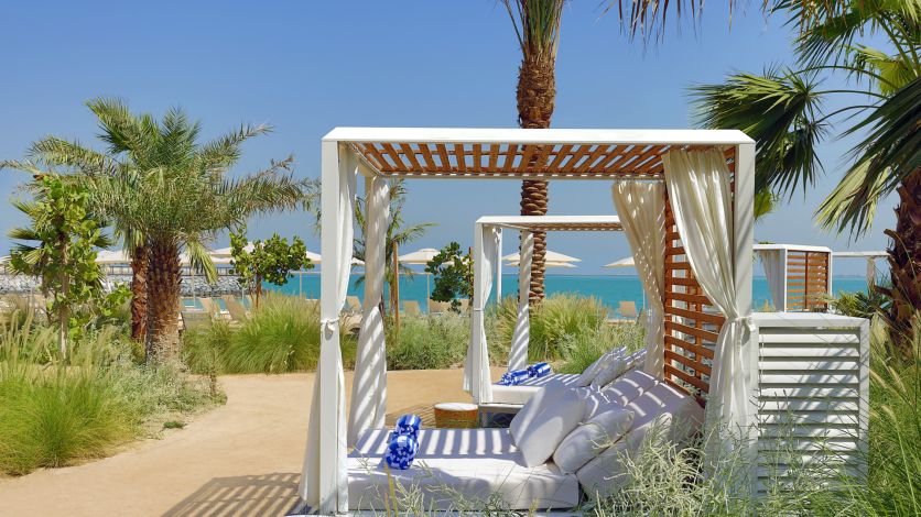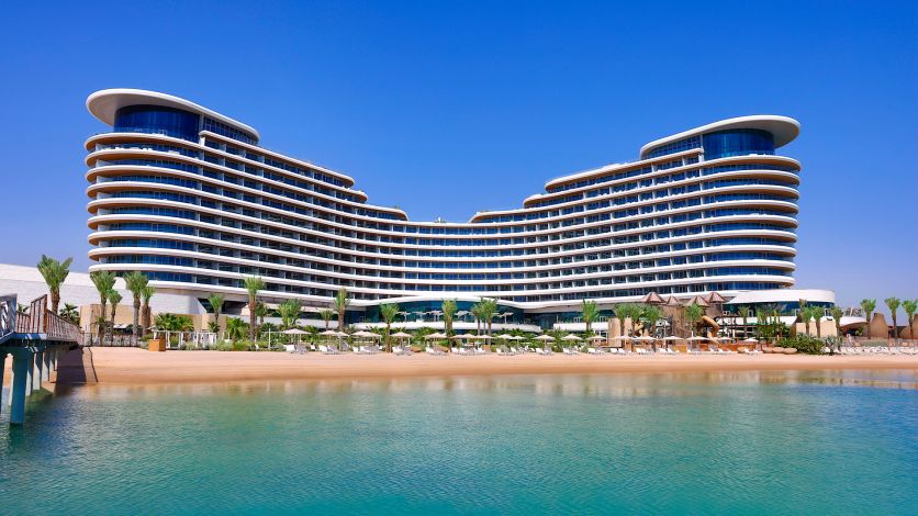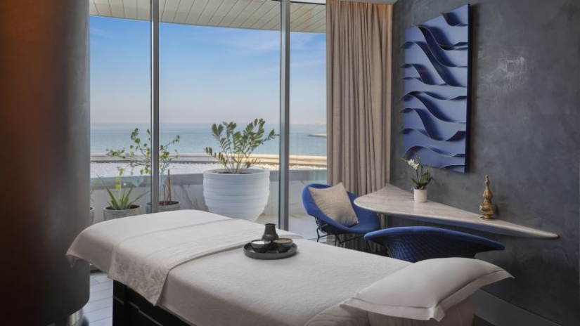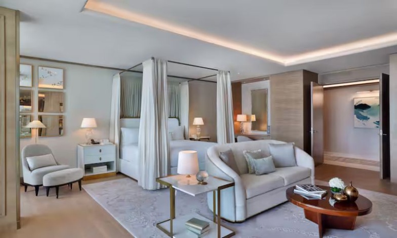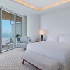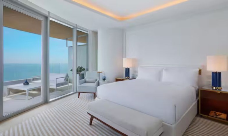 Спальня с двуспальной кроватью king-size, гостиная комната с диваном и обеденным столом, окна от пола до потолка, ванная комната с ванной и душем, гостевой туалет, гардеробная, балкон площадью 50 м² изогнутой формой предлагая зону для отдыха с видами на Аравийский залив;