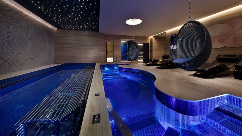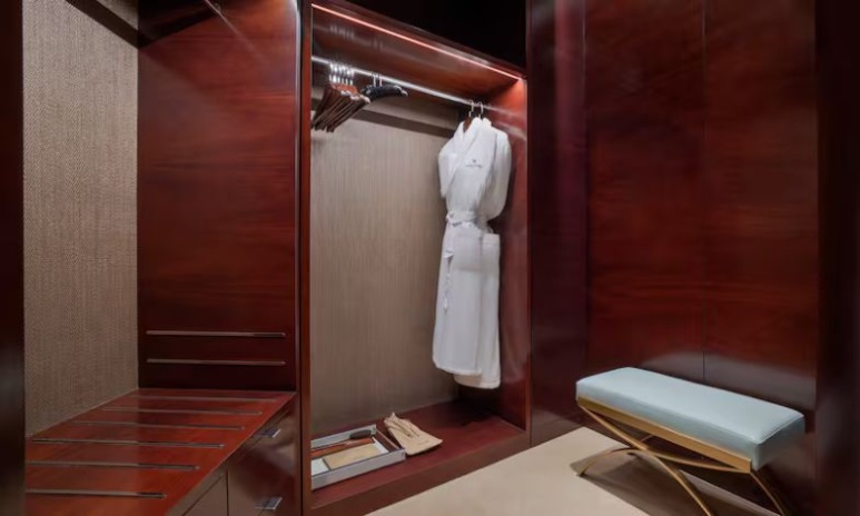 Спальня с двуспальной кроватью king-size, гостиная комната с диваном и обеденным столом, окна от пола до потолка, ванная комната с ванной и душем, гардеробная, гостевой туалет, балкон площадью 45 м² изогнутой формой;