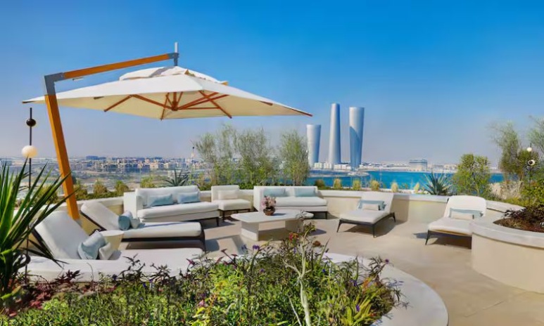 Пентхаус с террасой на крыше, спальня, гостиная комната с зонами отдыха и кабинета, а также обеденным столом и кухонным уголком, ванная комната с ванной и душем, панорамные окна от пола до потолка, сад на крыше площадью 1 140 м², вид на залив.