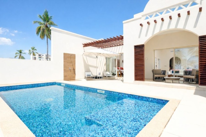 2 спальни с двуспальными кроватями king-size, 2 дополнительные раскладные кровати, 2 гардеробные, гостиная комната, 2 ванные комната (одна с ванной и душем, вторая с душем), 2 душа под открытым небом, терраса, персональный бассейн, план номера.