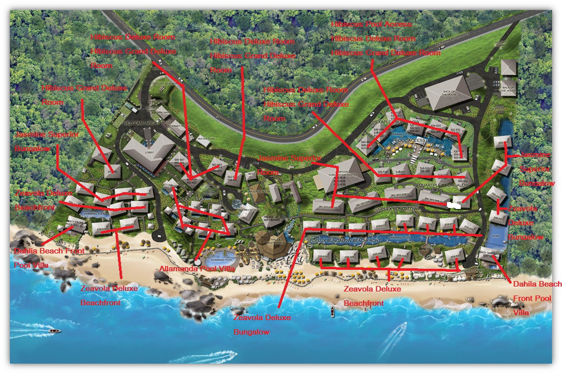 В двухэтажных строениях, окруженных тропическими растениями располагаются люксы, в том числе семейные, с террасами или балконами и видом на океан. Для приватного отдыха предлагаются просторные виллы с собственным садом, террасой для загара и частным бассейном.