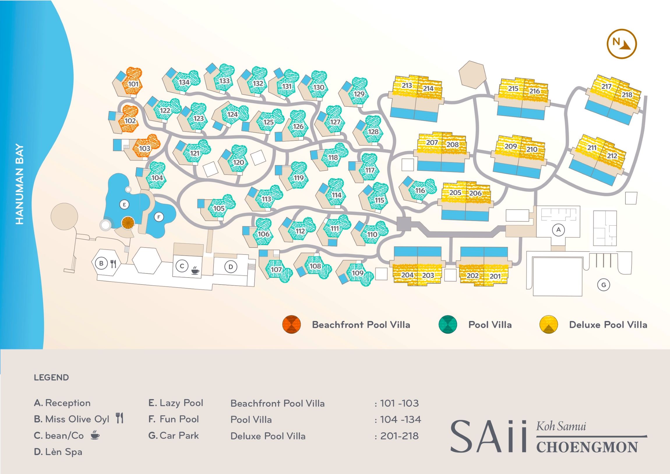 Номера категории Ocean, а также сьюты находятся в трехэтажном главном здании и обращены на восток, в то время как тайские павильоны расположены в саду. Масло для ароматических ламп, туалетные принадлежности, постельное белье и подушки подбираются в соответствии с предпочтениями каждого гостя.
