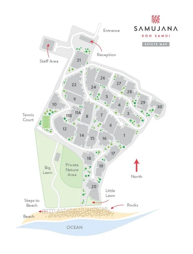 Виллы Samujana расположены на склоне холма с видом на Сиамский залив, рядом с пляжем. Курорт предлагает около 20 современных вилл тайской архитектуры с 1–8 спальнями, частными бассейнами, садами и панорамными видами. В каждой вилле — кухня, кинотеатр, тренажёрный зал, спа-комната, зона барбекю и другие удобства (в зависимости от категории).