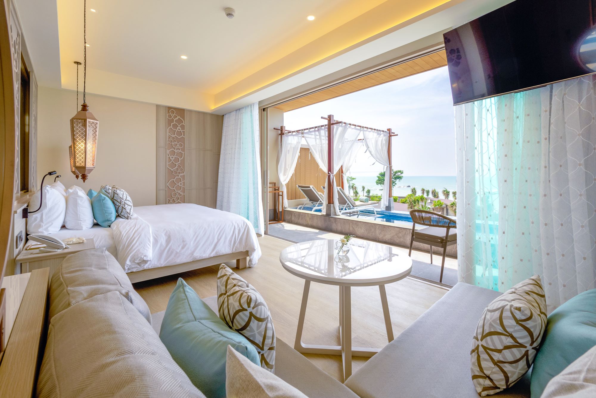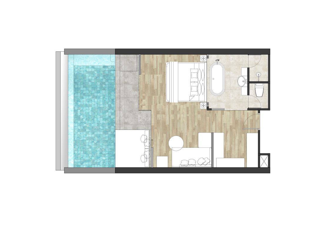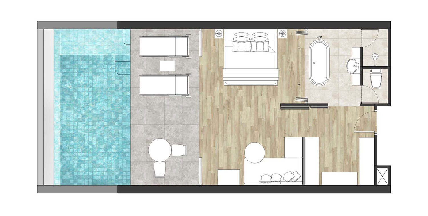 В отеле предлагаются два типа размещения, оба – с частными бассейнами. Сьюты находятся в трёхэтажном здании с видом на море, обеспечивая уединённый отдых. Виллы на берегу оснащены двумя бассейнами, создавая уникальные условия для отдыха у моря. Также к услугам гостей открытый бассейн, тренажёрный зал, массажный павильон.