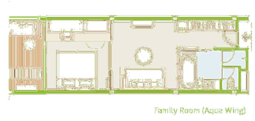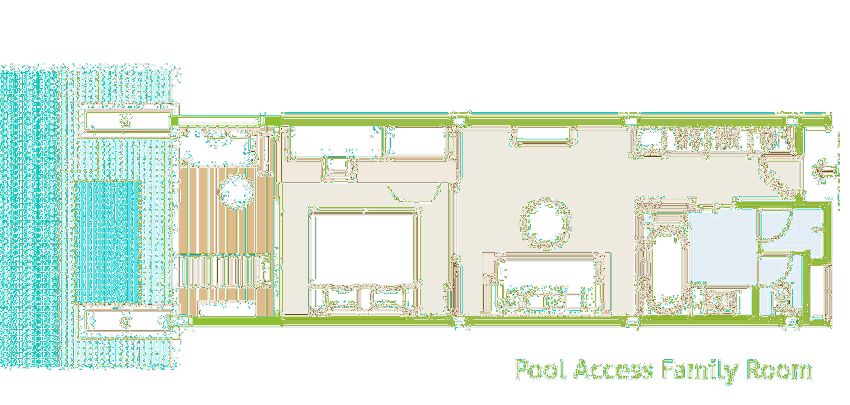 Просторный номер для семьи, 2 спальные зоны (с раздвижной дверью между ними): двуспальная кровать king-size и раскладная кровать для 2 детей, ванная комната с ванной и душем, доступ к небольшому бассейну, который расположен рядом с основным бассейном, терраса номера защищена стеклянной дверью с внешним замком для безопасности ребёнка, план номера;