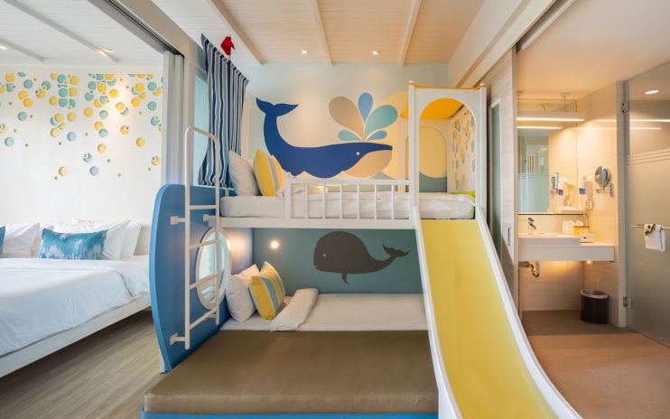Семейный номер с двухъярусной кроватью в морской тематике, оснащённой горкой, спальня родителей с двуспальной кроватью отделена раздвижной дверью, ванная комната с душем, балкон или терраса, план номера;