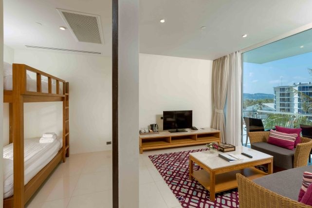 Спальня с двуспальной кроватью, гостиная комната с диваном, небольшая спальная зона с двухъярусной кроватью, ванная комната с душем, балкон;