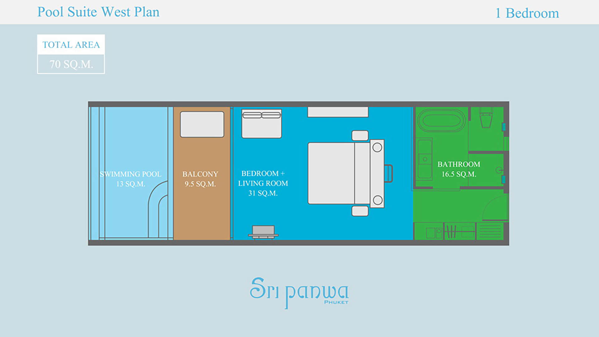 Расположены в крыле Pool Suite West, двуспальная кровать или 2 односпальные кровати, ванная комната с ванной и душем, балкон, персональный бассейн, вид на море, план номера;