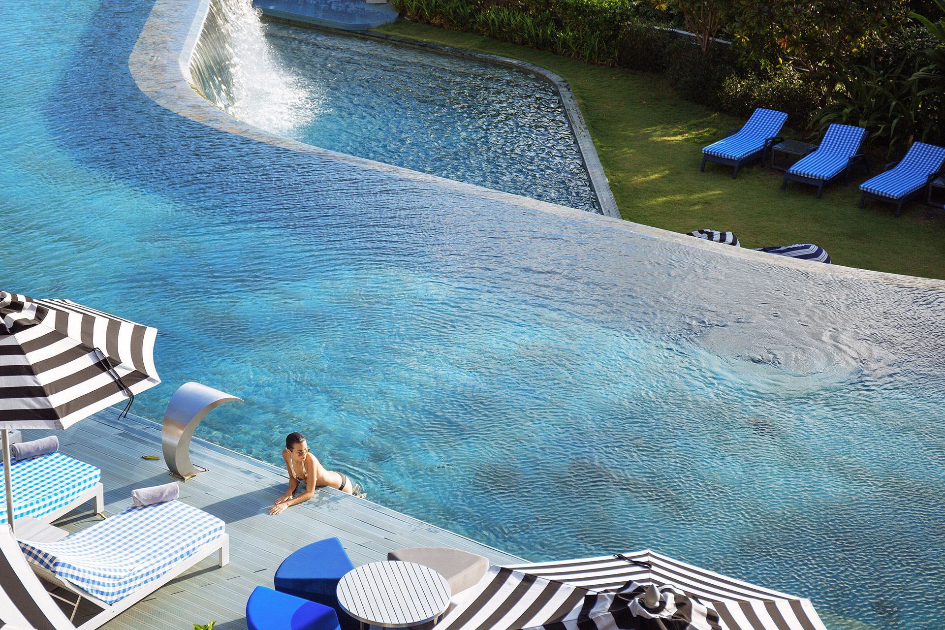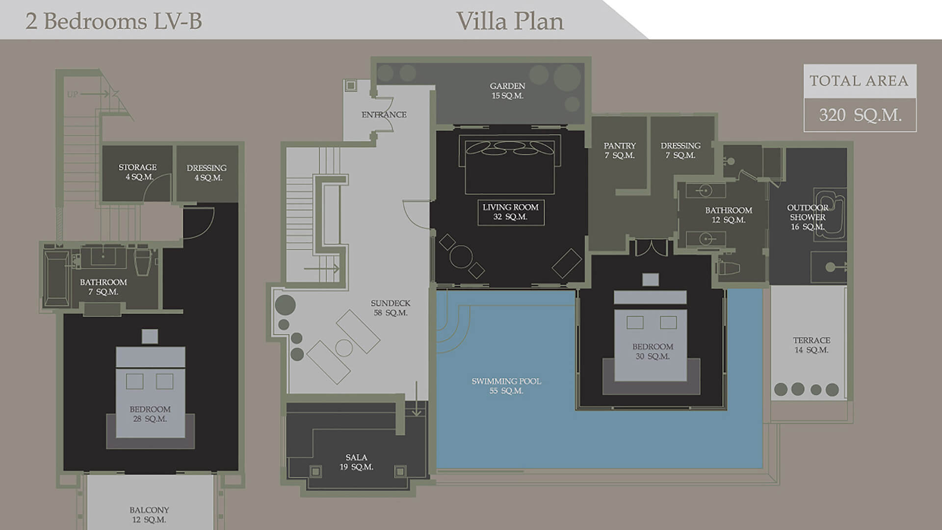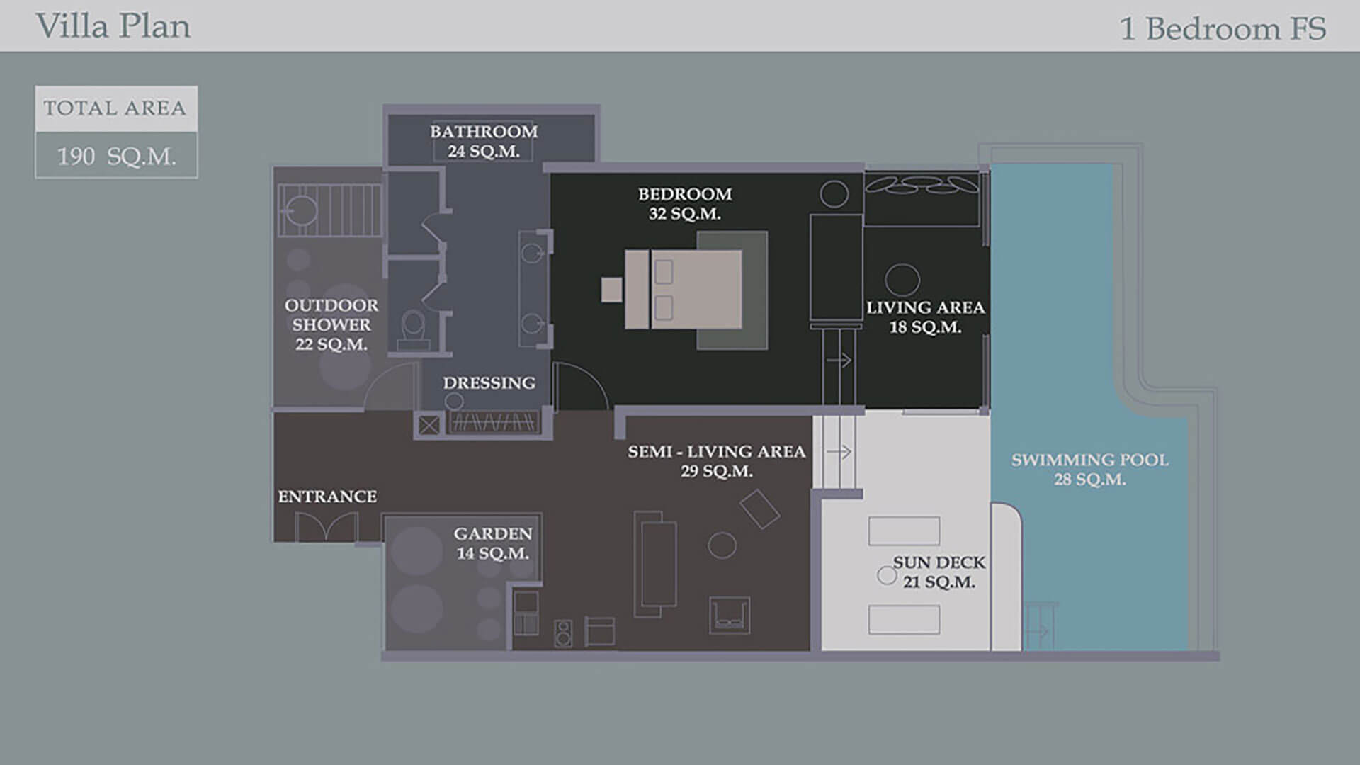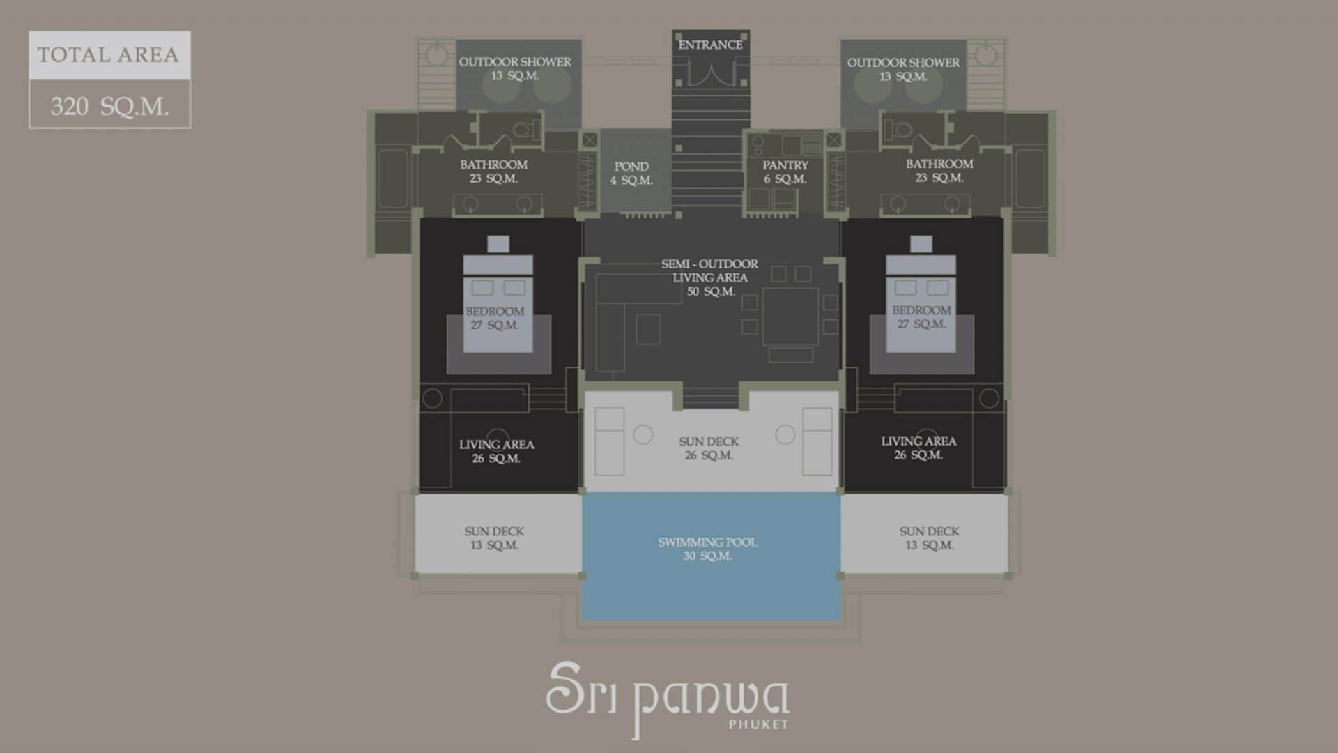 Резиденция состоит из 4 отдельных частных вилл по 140 – 150 м², каждая с инфинити-бассейном, иногда с деревом в середине, и уютной гостиной. В каждой вилле и у общего бассейна установлена система BOSE, есть современный бар и просторная солнечная терраса с зоной для активного отдыха на свежем воздухе. Огромный бассейн с современной водной стеной и бар для любителей вечеринок, панорамные виды на океан, план номера;