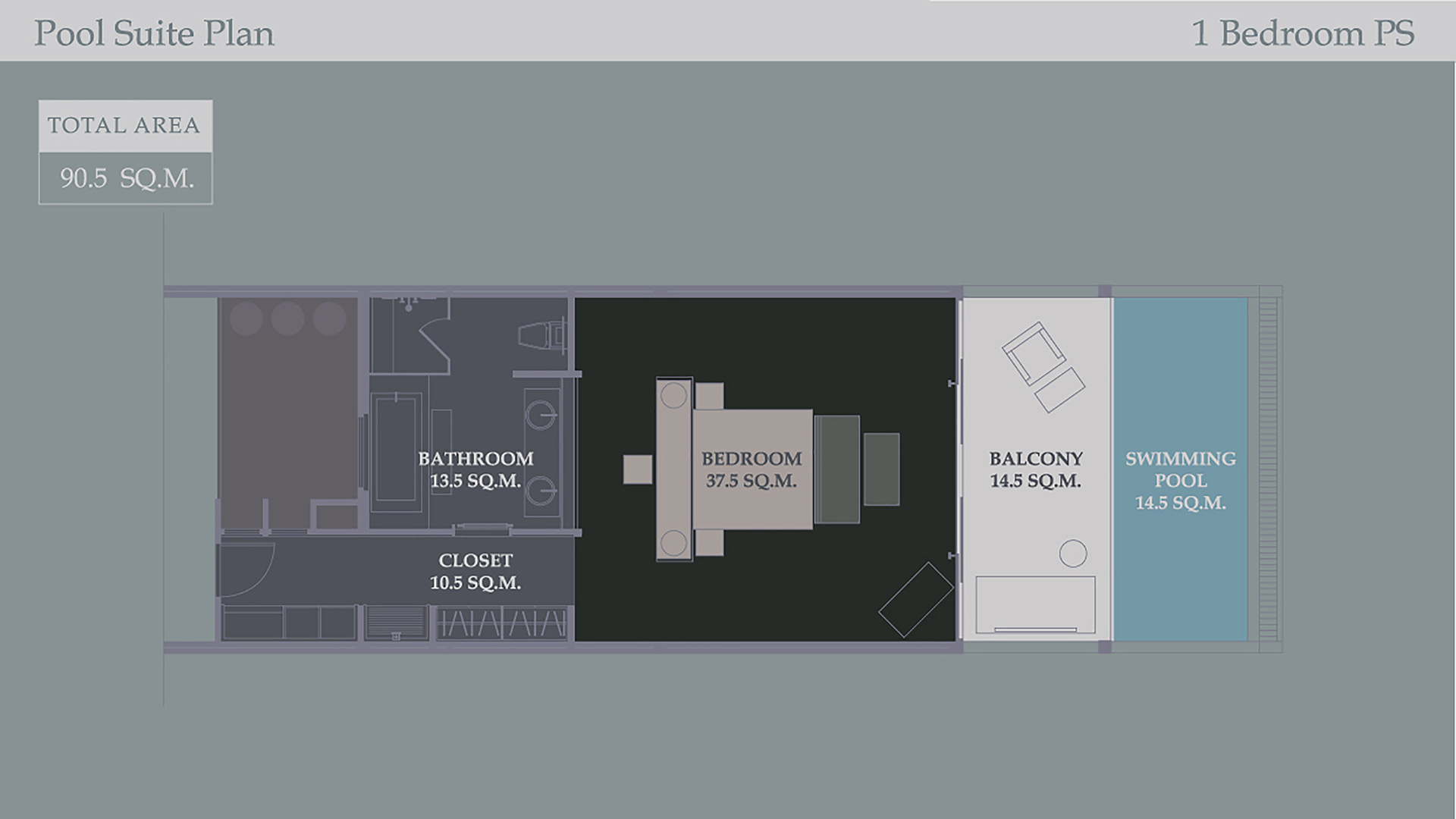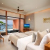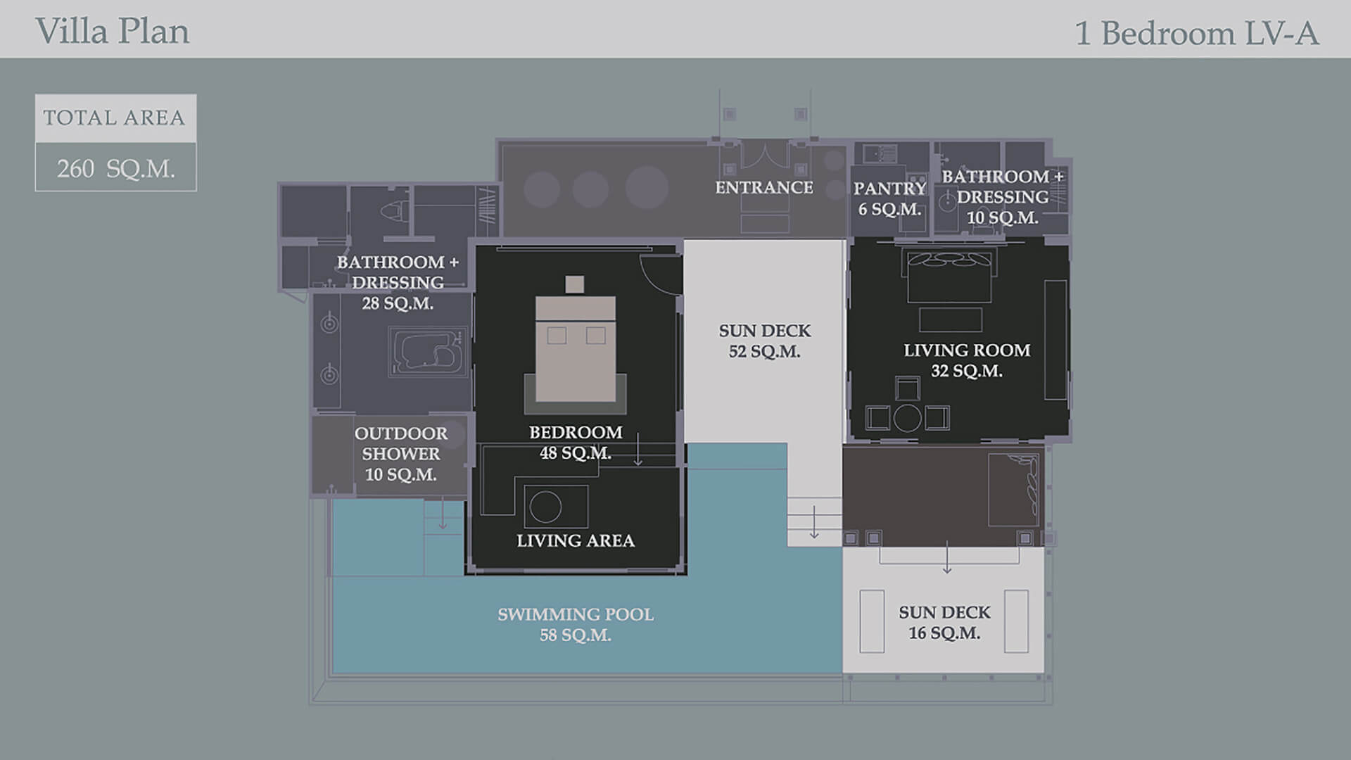 Type A: спальня, гостиная комната с кухонным уголком, особенностью виллы является солнечная терраса, расположенная между спальней и гостиной, 2 ванные комнаты, гардеробная, душ под открытым небом, терраса, персональный бассейн, вид на океан, план номера;