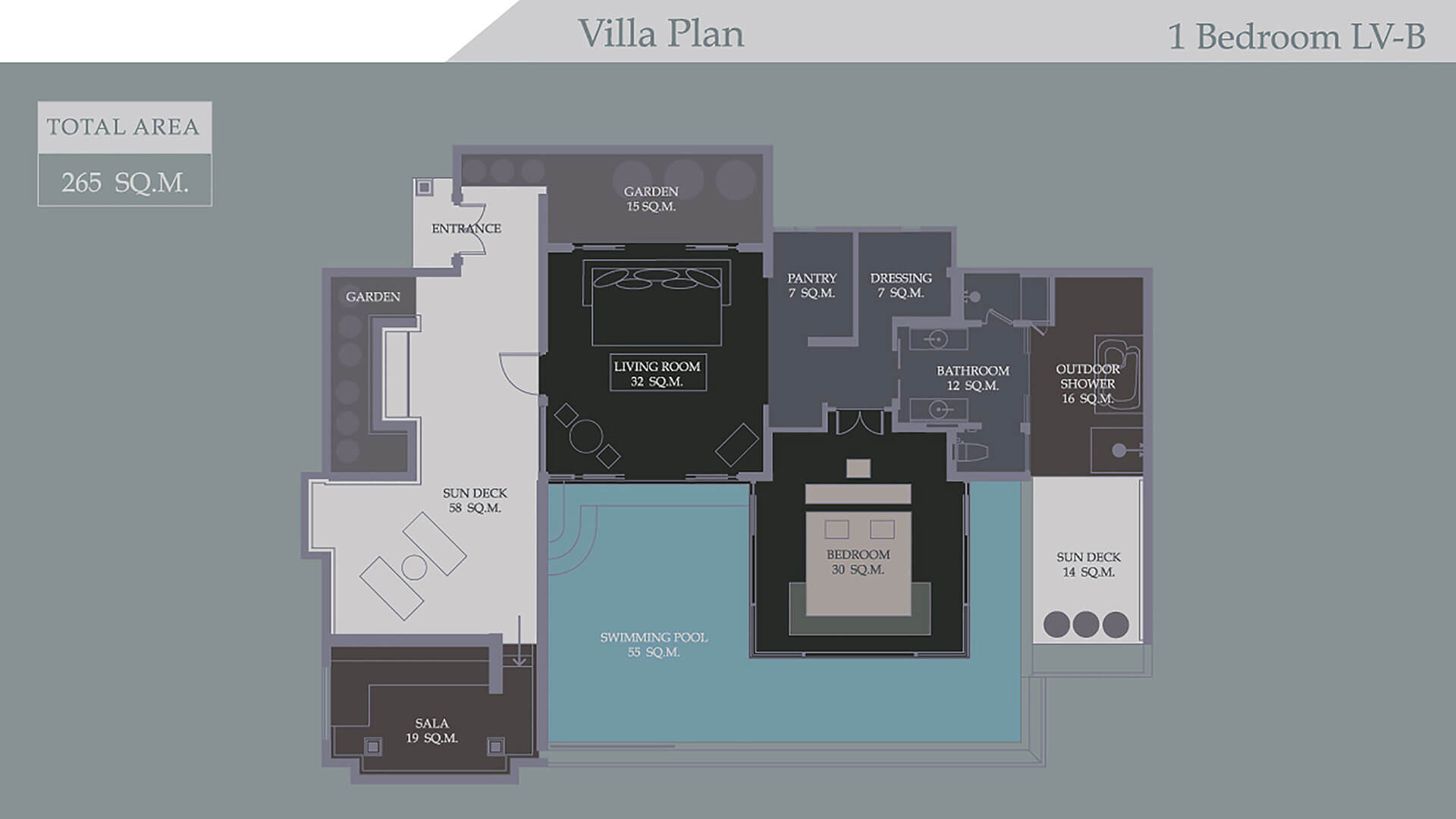 Type B от 260 до 300 м²: спальня, гостиная комната, кухонный уголок, гардеробная, ванная комната с душем, душ под открытым небом, частный садик, 2 террасы, персональный бассейн, беседка, вид на океан, план номера;