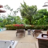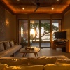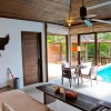 2 спальни, ванная комната и отдельный душ на открытом воздухе. Спальни разделены открытой гостиной зоной с кухней, обеденной зоной, большой раскладной софой, лежаками и бассейном, вид на сад;