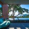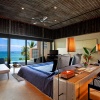 2 спальни, ванная комната и отдельный душ на открытом воздухе. Спальни разделены открытой гостиной зоной с кухней, обеденной зоной, большой раскладной софой, лежаками и бассейном, вид на океан, план номера;