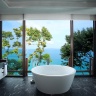 Расположены на высоте до 60 метров над уровнем моря, спальня с двуспальной кроватью, гостиная комната с диваном, обеденным столом и кухонным уголком, ванная комната с ванной и душем, балкон, персональный бассейн, вид на море, план номера;