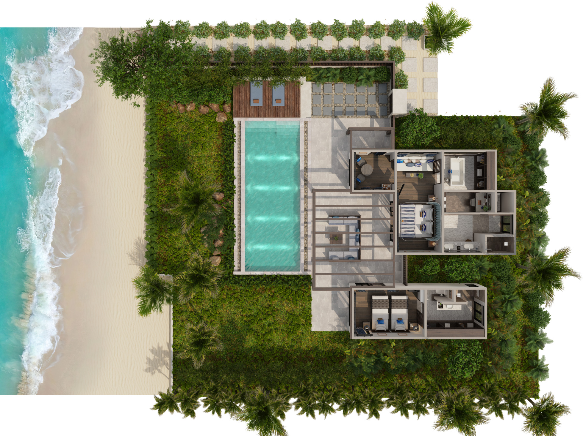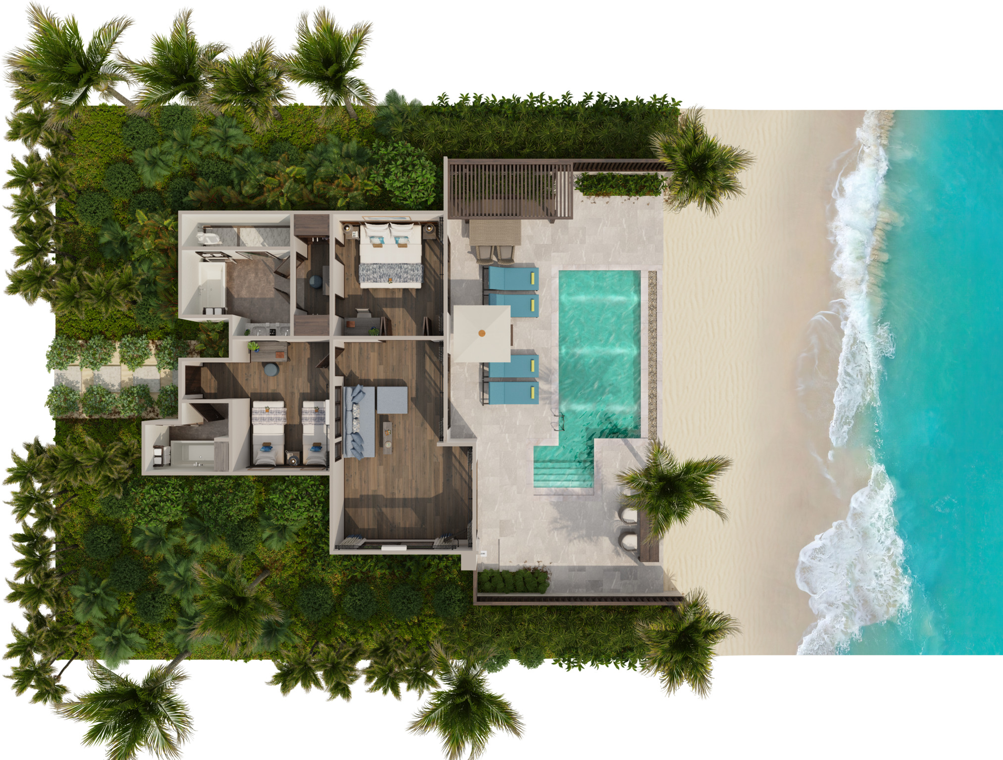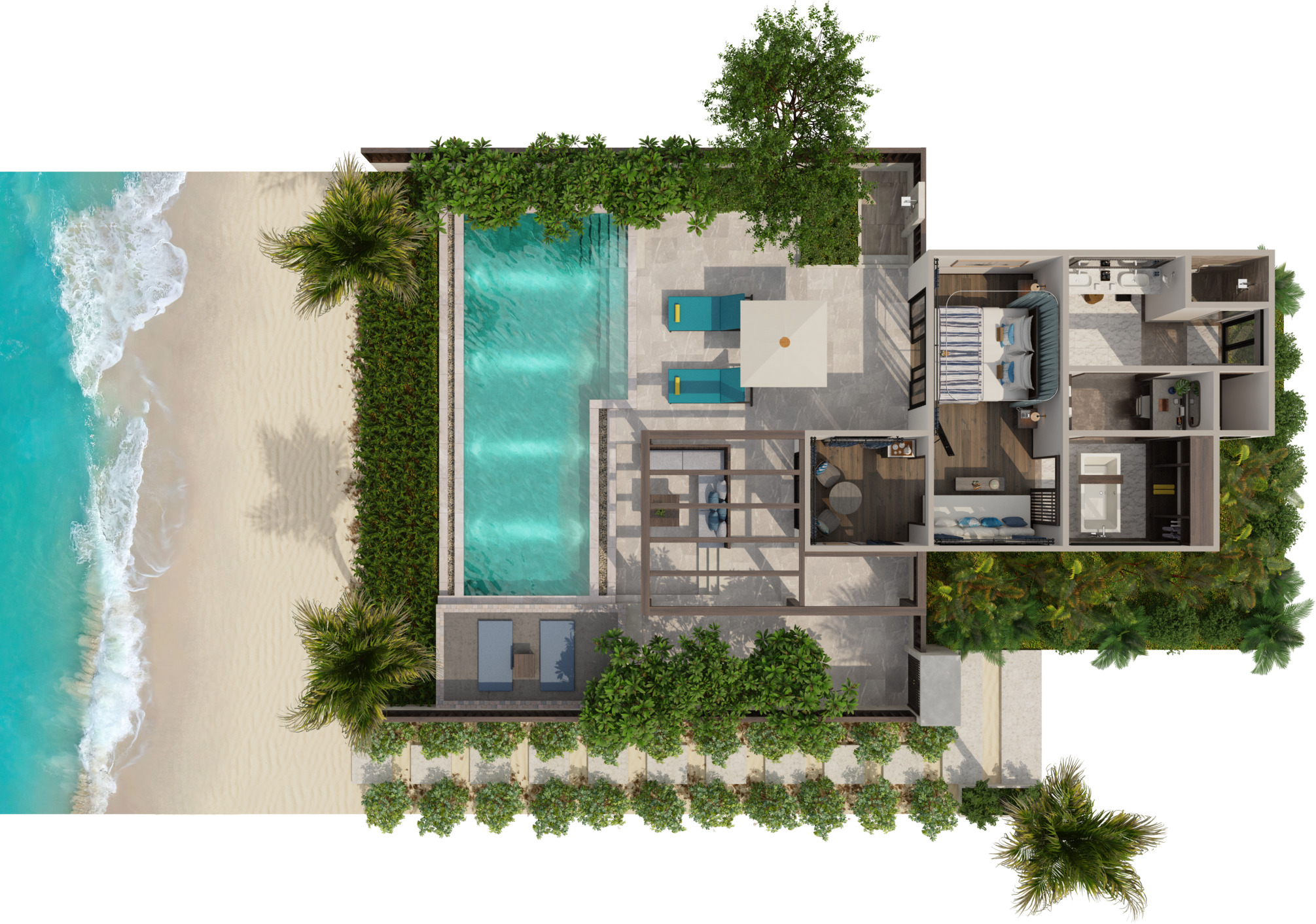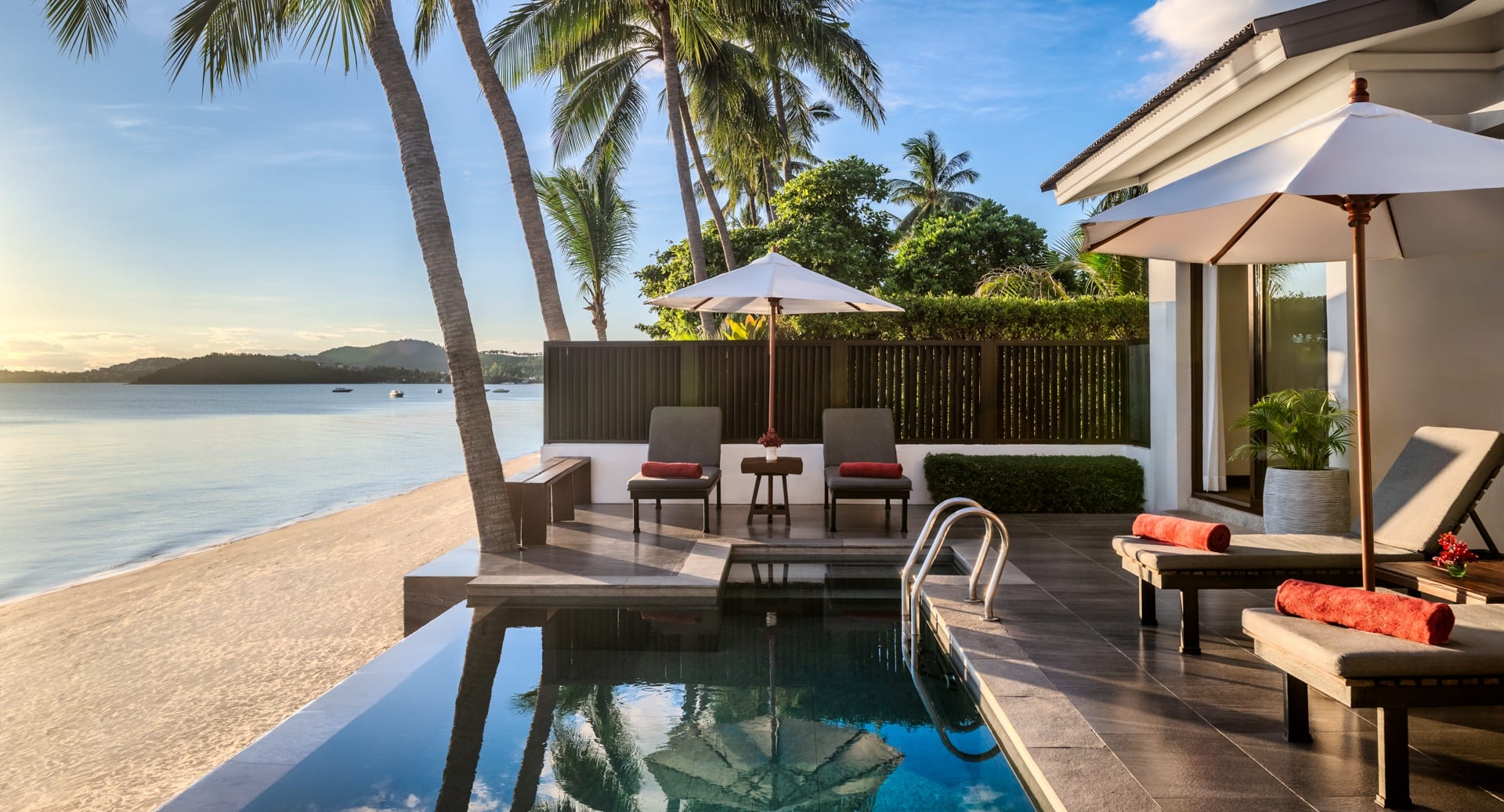 Отдельная вилла на берегу моря c 2-мя спальнями и межкомнатными дверьми: главная спальня с двуспальной кроватью, собственной ванной комнатой с душем, ванной и гардеробной; гостиная с диваном, кофемашина, туалетная комната; вторая спальня с 2-мя односпальными кроватями, собственной ванной комнатой с ванной и душем; меблированная терраса с зоной отдыха под навесом, шезлонги, зонт, душ на открытом воздухе, сад, панорамный бассейн, выход на пляж;