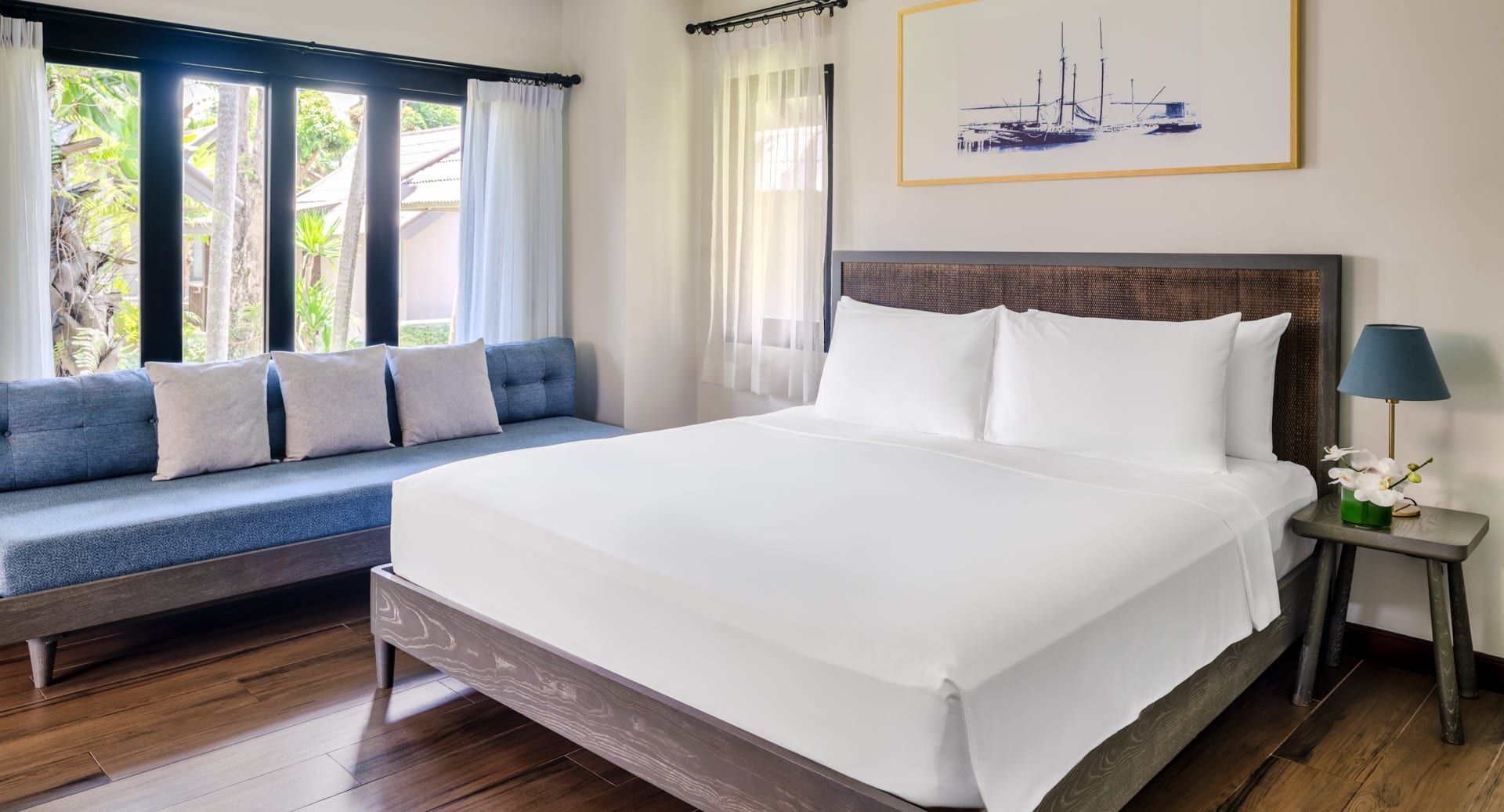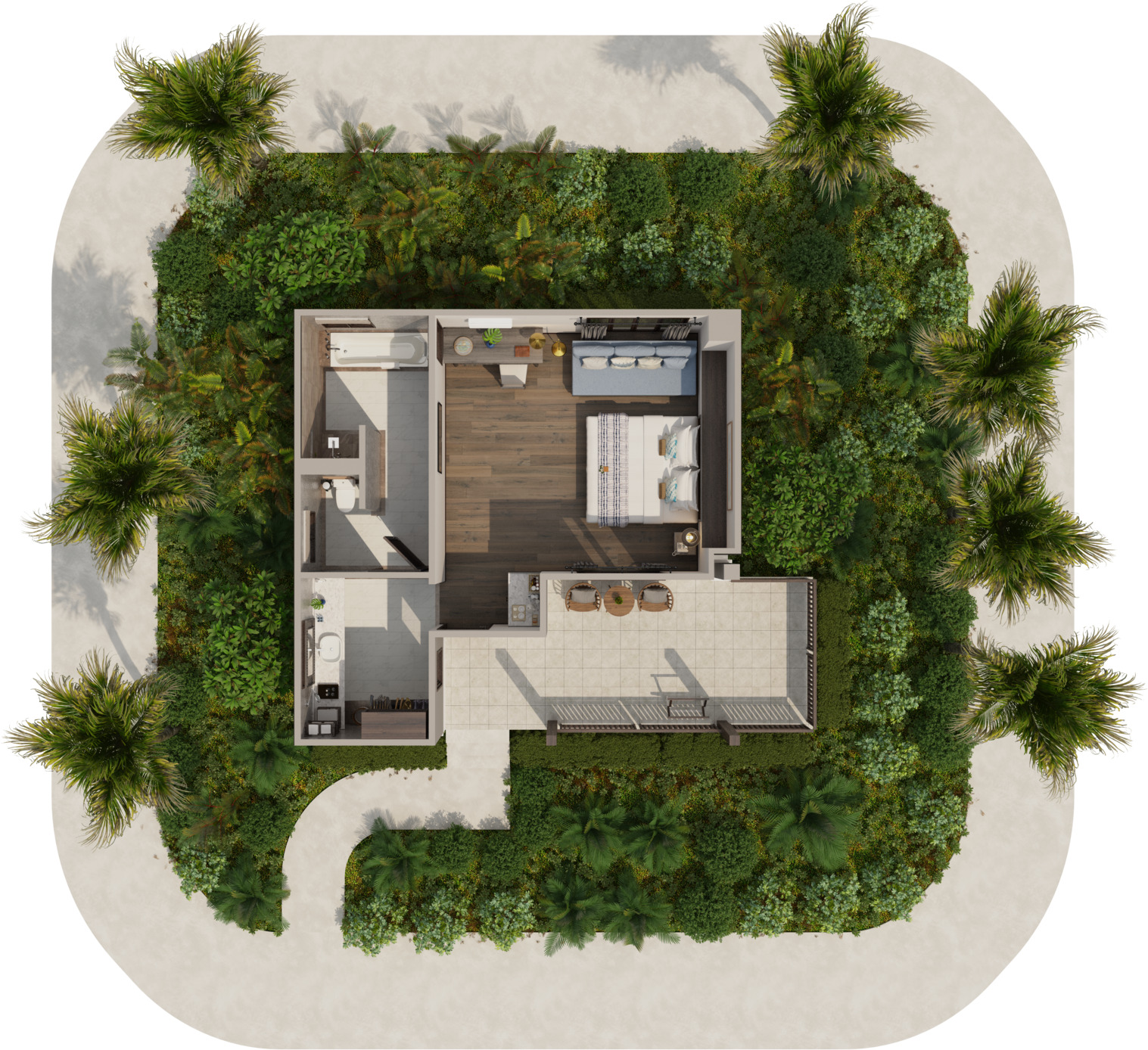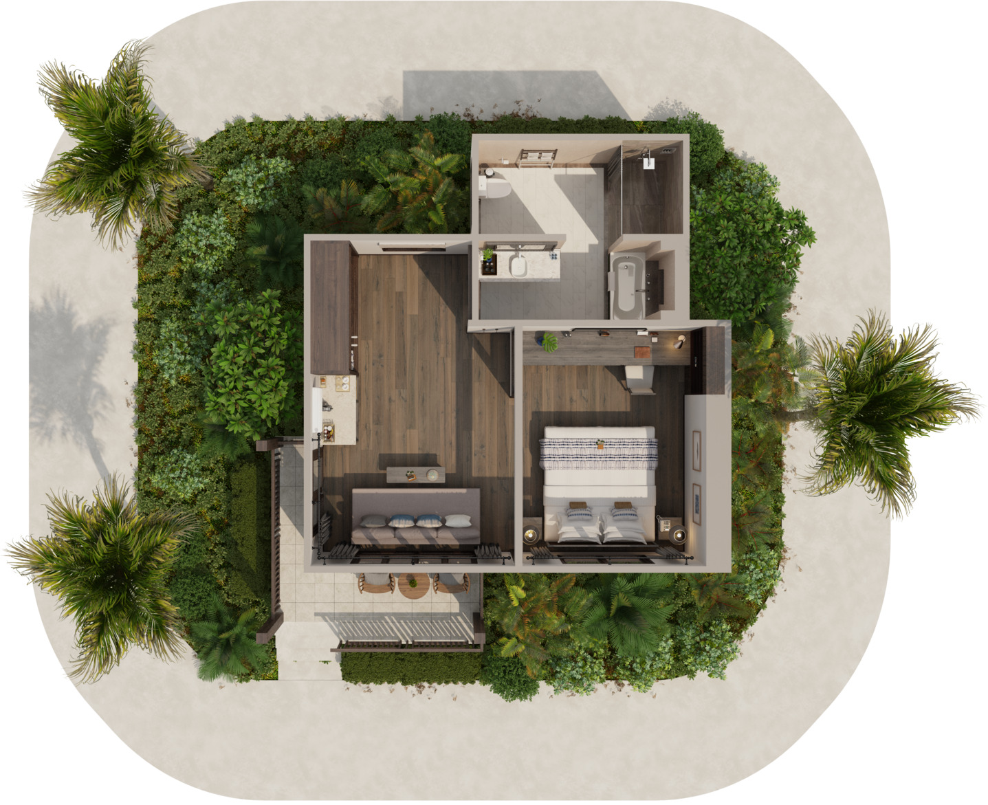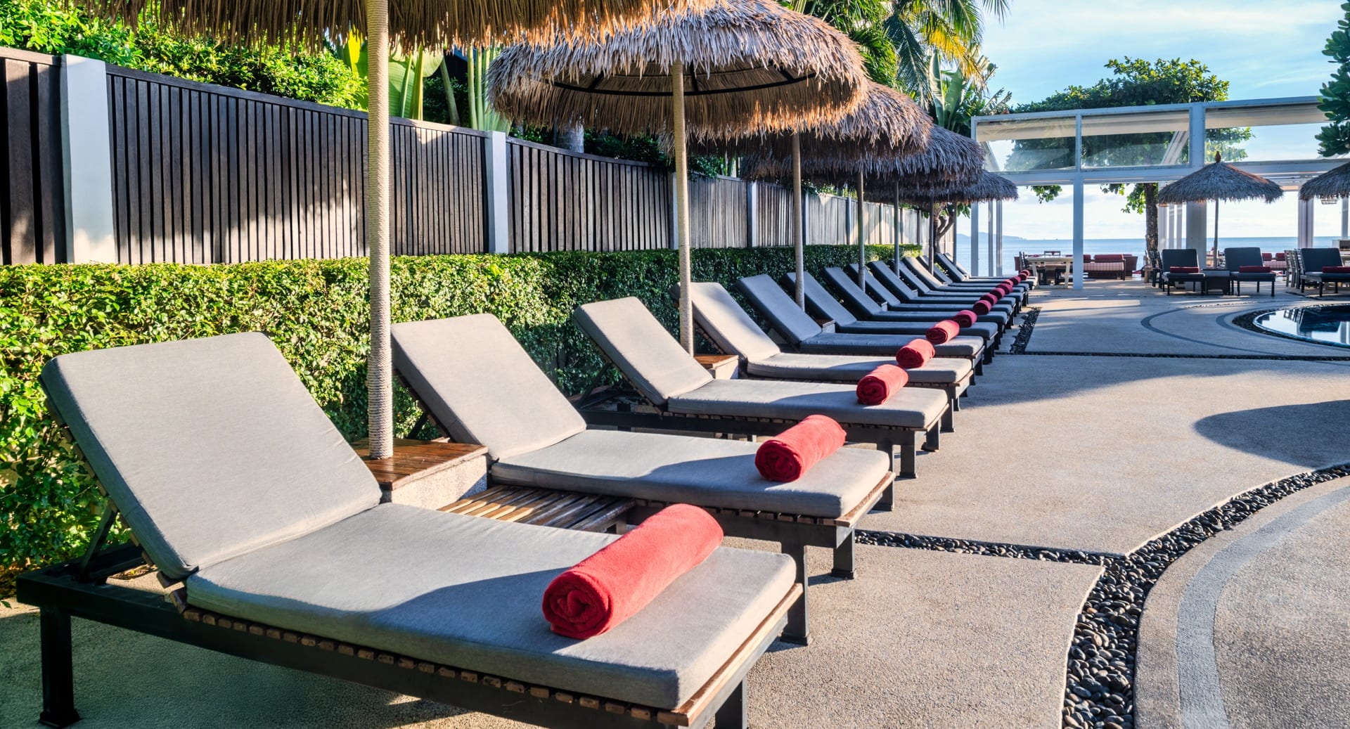 Отдельная вилла на берегу моря c 2-мя спальнями и межкомнатными дверьми: главная спальня с двуспальной кроватью, собственной ванной комнатой с душем, ванной и гардеробной; гостиная с диваном, кофемашина, туалетная комната; вторая спальня с 2-мя односпальными кроватями, собственной ванной комнатой с ванной и душем; меблированная терраса с зоной отдыха под навесом, шезлонги, зонт, душ на открытом воздухе, сад, панорамный бассейн, выход на пляж;