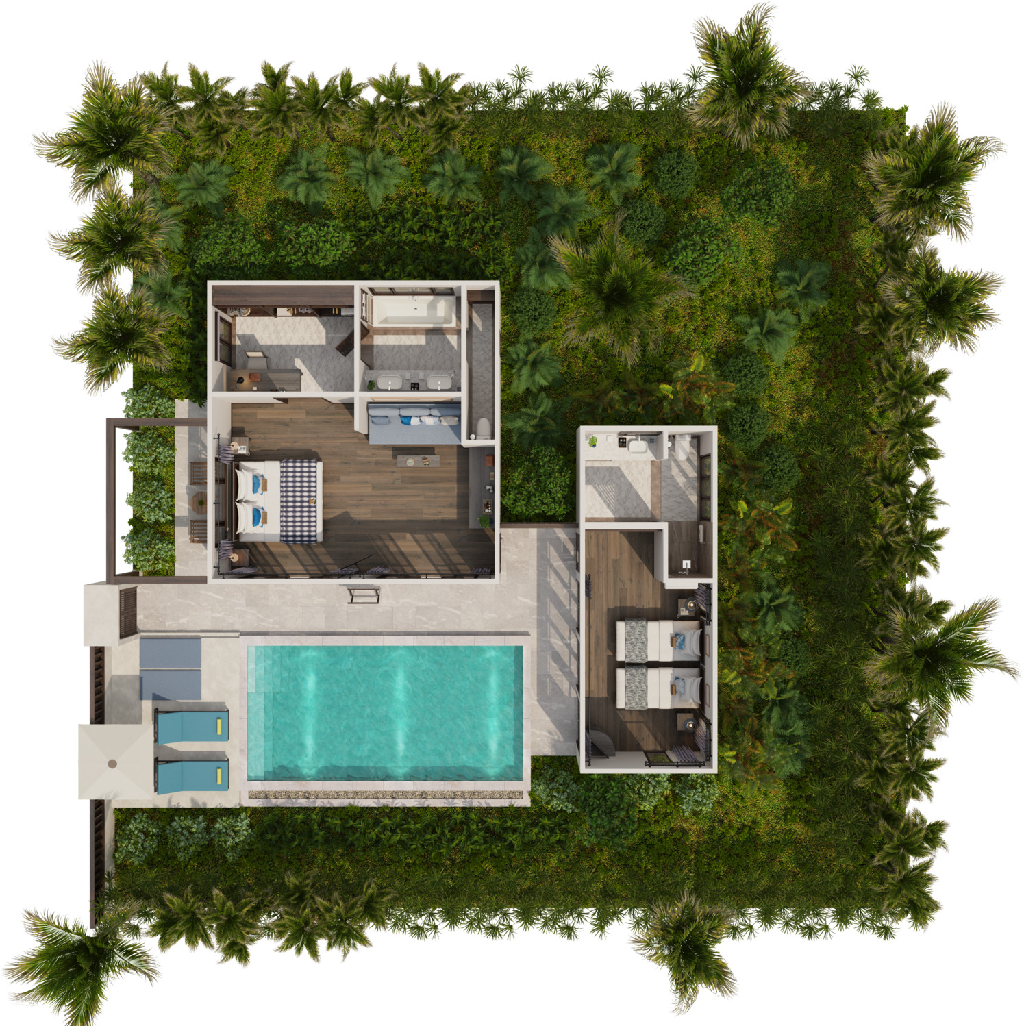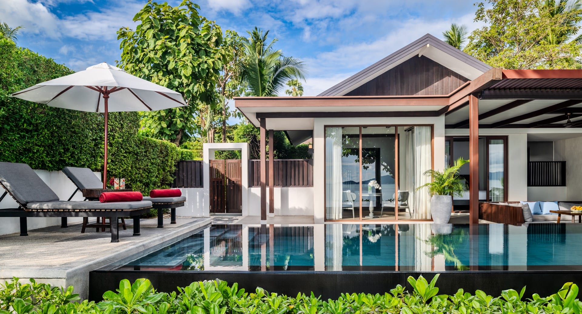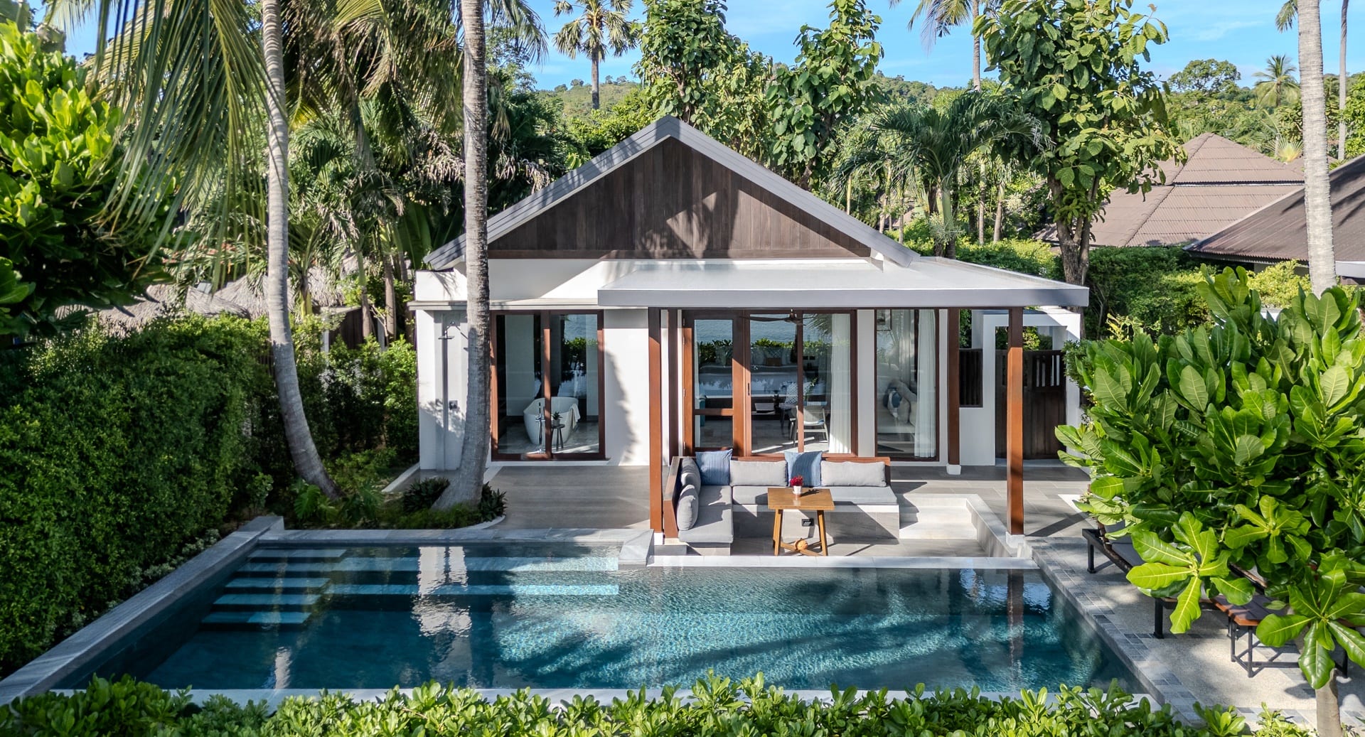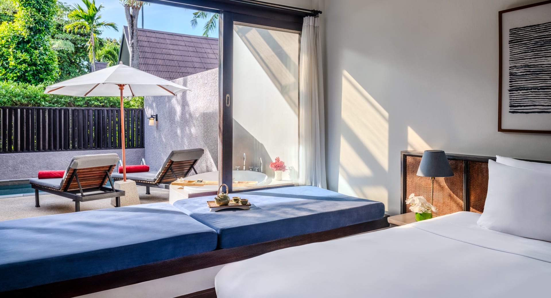 Отдельная вилла с 2-мя спальнями и межкомнатными дверьми: спальня с двуспальной кроватью, собственной ванной комнатой с душем, ванной и гардеробной; спальня с 2-мя односпальными кроватями с собственной ванной комнатой с душем; гостиная с диваном, кофемашина, терраса и дворик с частным бассейном, шезлонги, зонт, душ на открытом воздухе;