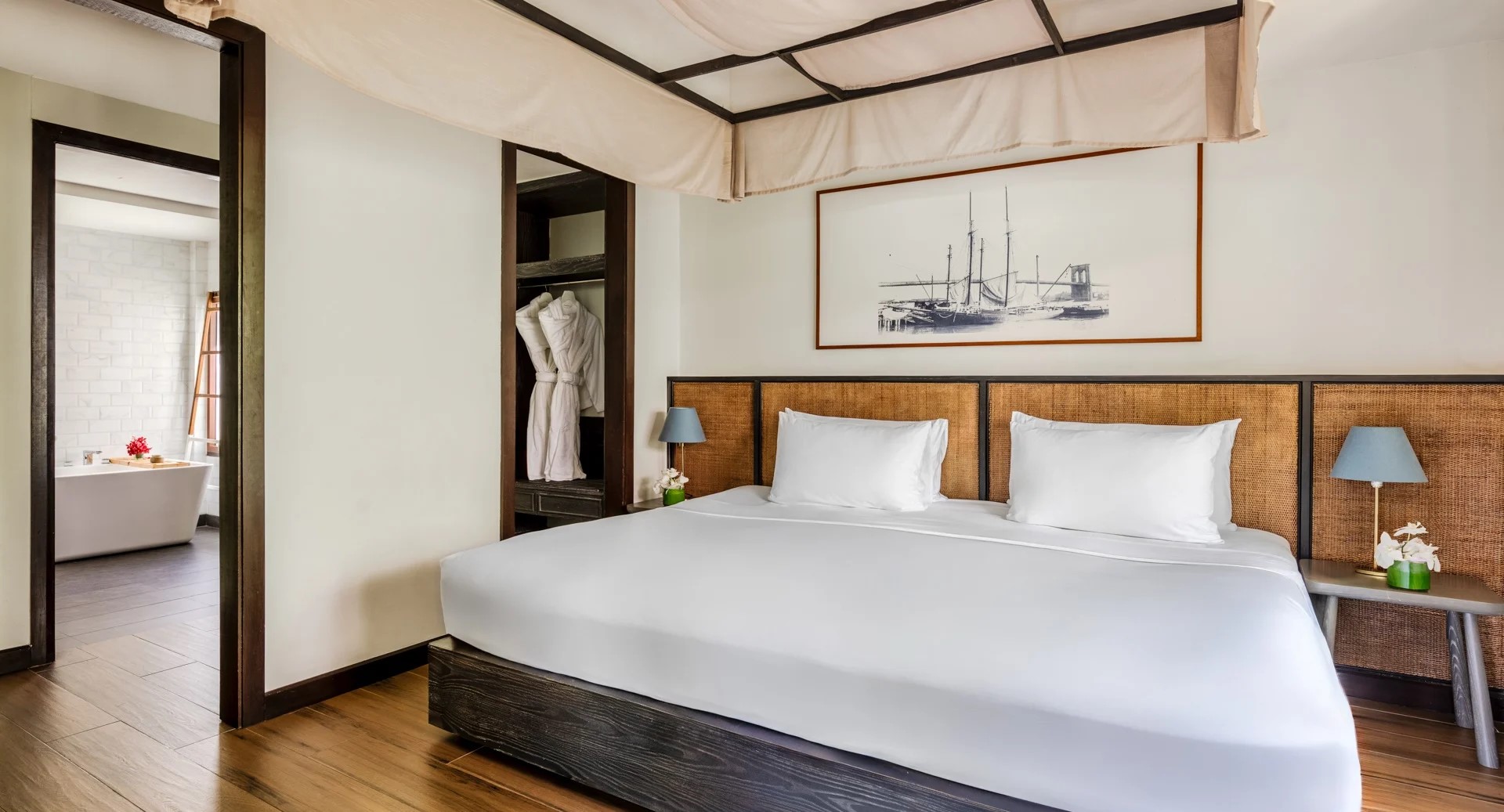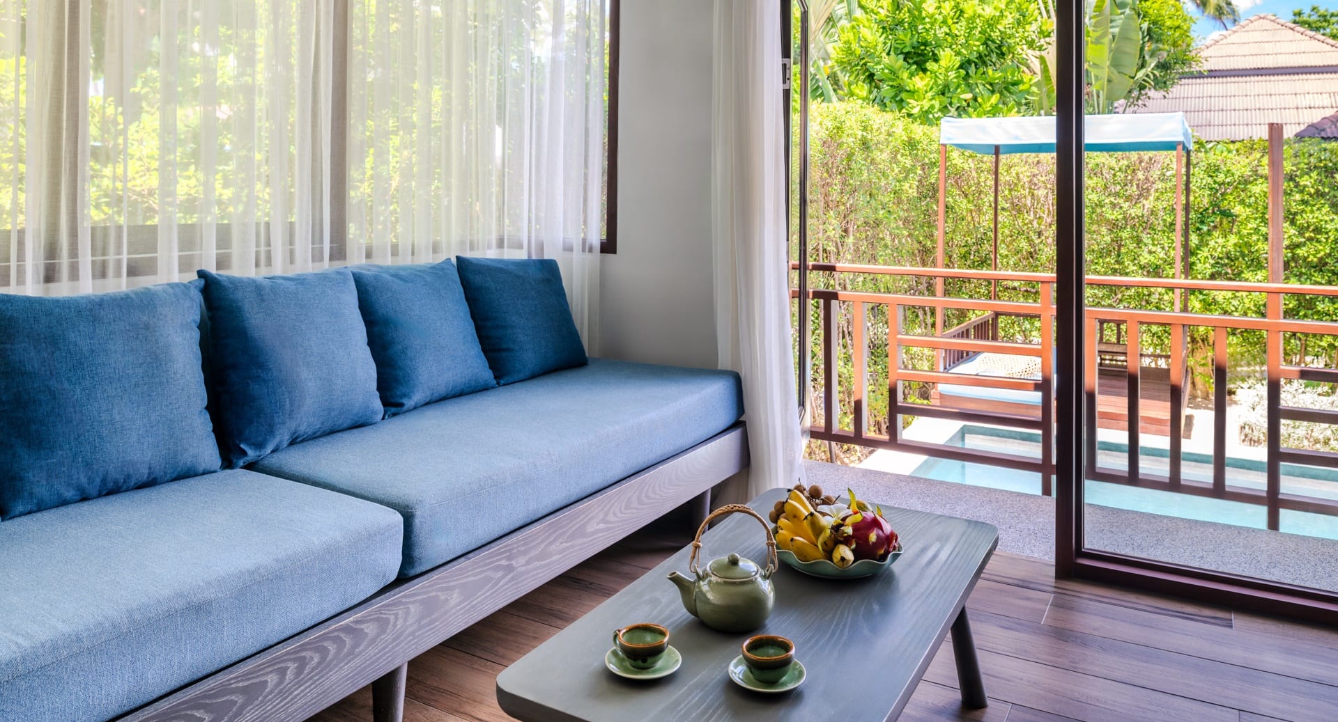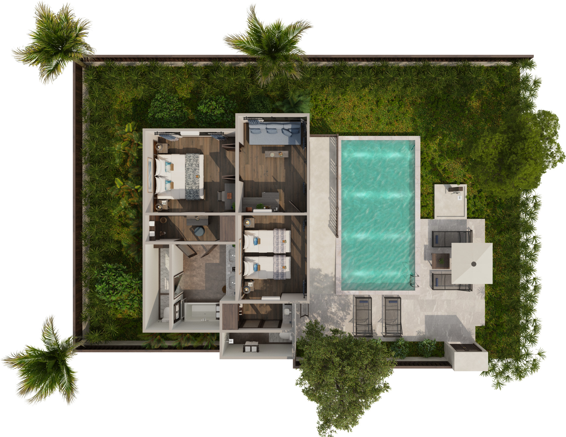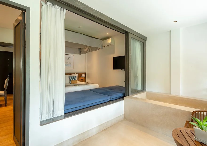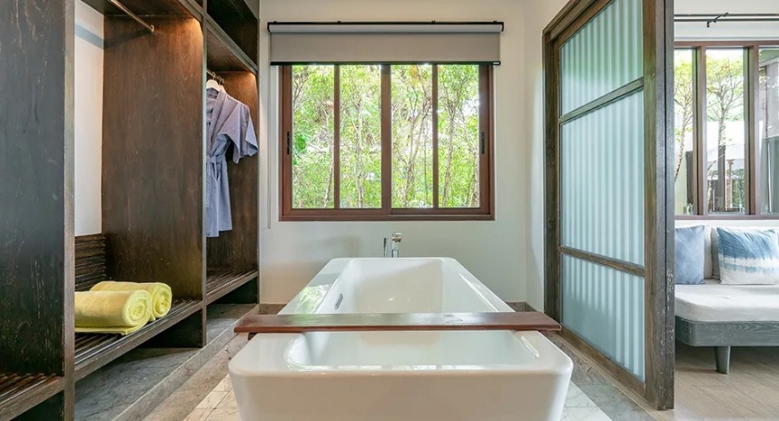 Отдельная вилла с 2-мя спальнями и межкомнатными дверьми: спальня с двуспальной кроватью, собственной ванной комнатой с душем, ванной и гардеробной; спальня с 2-мя односпальными кроватями с собственной ванной комнатой с душем; гостиная с диваном, кофемашина, терраса и дворик с частным бассейном, шезлонги, зонт, душ на открытом воздухе;