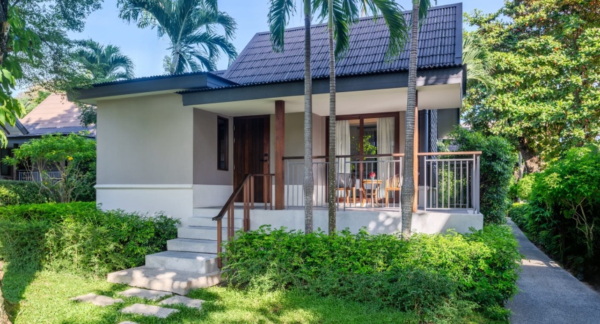 Отдельная вилла с открытой планировкой: спальня с 1-ой двуспальной (10 номеров) или 2-мя односпальными кроватями (2 номера), зона гостиной с диваном, ванная комната с душем, меблированная терраса, вид на сад;