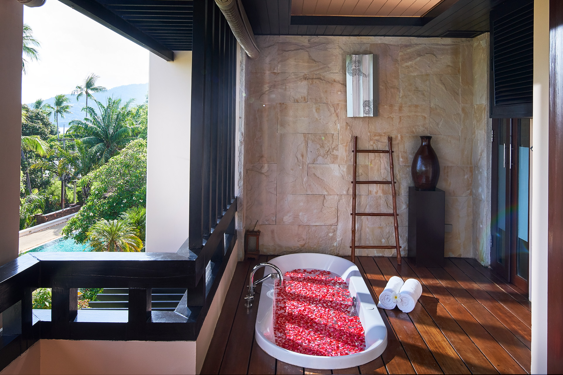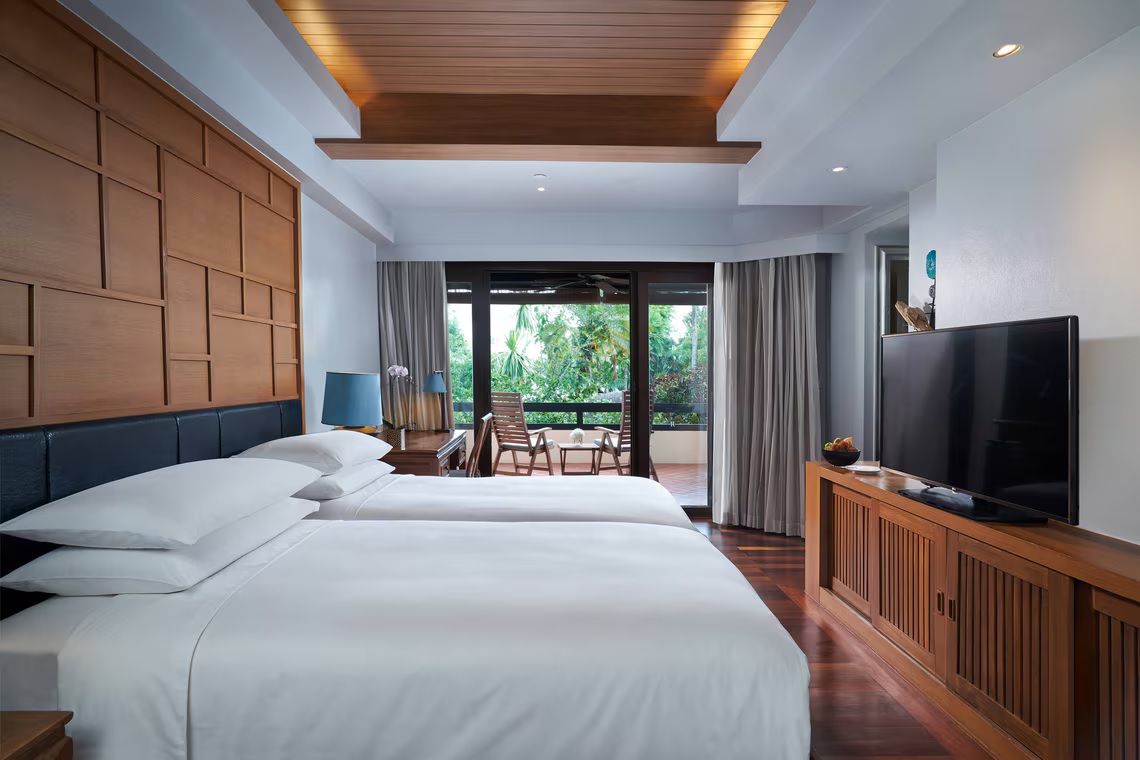 Номер на нижних этажах: 1 двуспальная или 2 односпальные кровати, отдельная ванная комната с душевой кабиной и ванной, меблированный балкон/терраса (12 м²) с ванной-джакузи на открытом воздухе, окна от пола до потолка, вид на сад, смежные номера (по запросу);