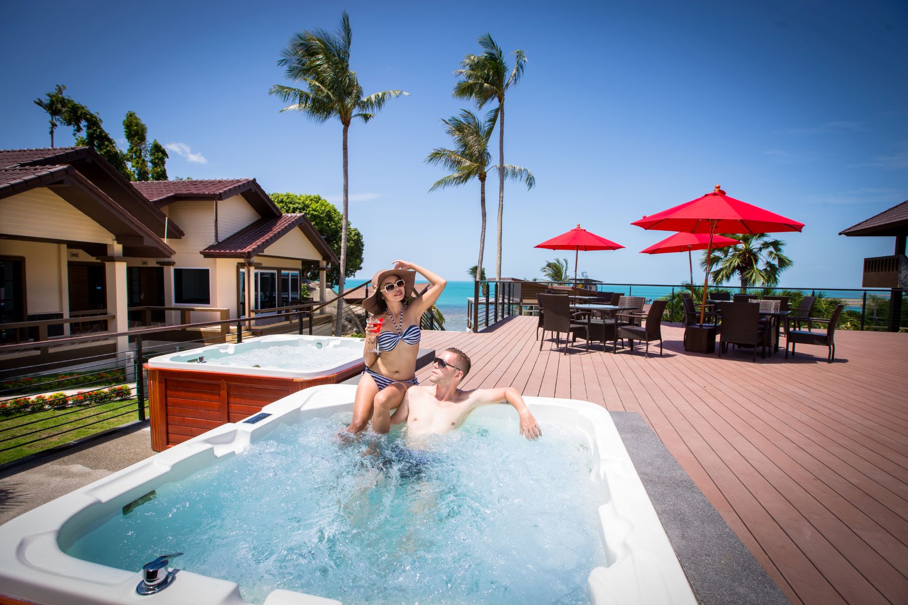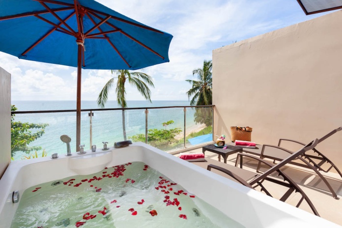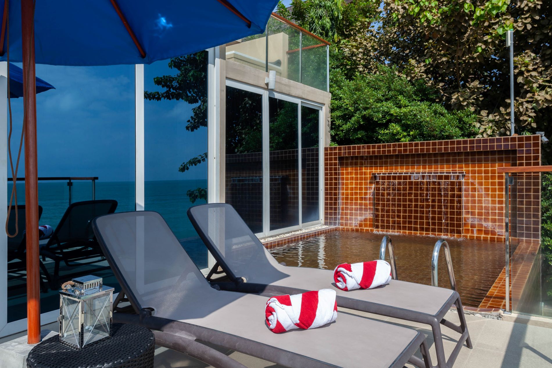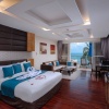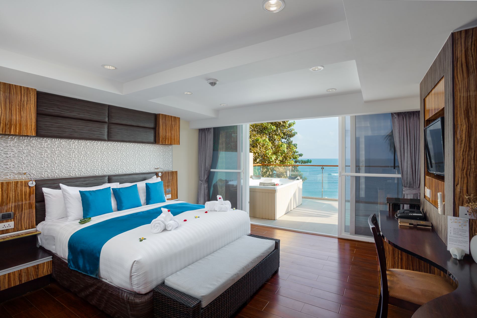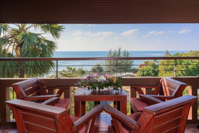 Люкс  открытой планировки с двуспальной кроватью, гостиной и обеденной зонами, ванная комната с душевой кабиной и ванной; меблированный балкон с ванной-джакузи и шезлонгами; панорамный вид на Сиамский залив;