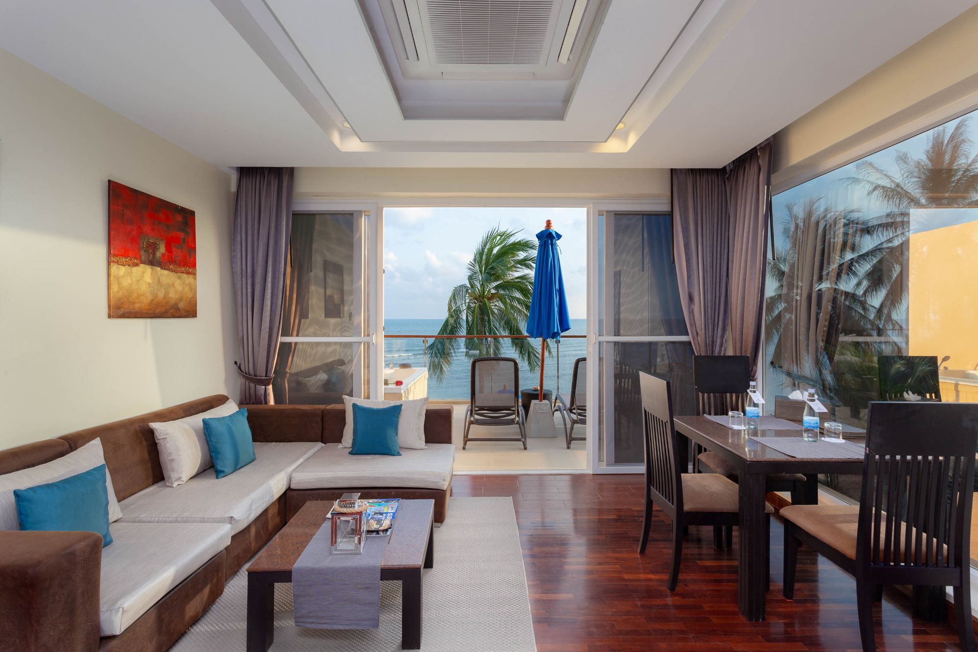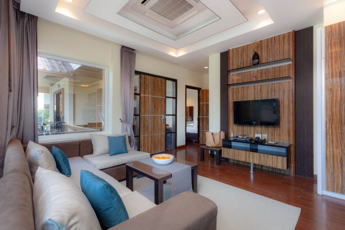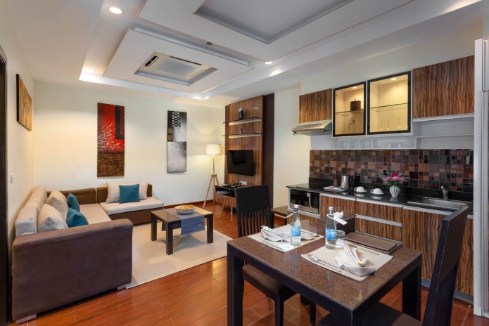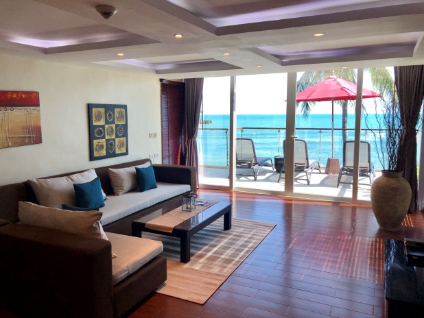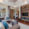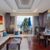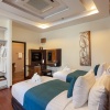 «Королевский» люкс с 2-мя спальнями: в главной спальне –  двуспальная кровать, во второй спальне –  3 односпальные кровати, 2 ванные комнаты; просторная гостиная с обеденной зоной на 6 персон и оборудованной кухней; просторная меблированная терраса с ванной-джакузи и шезлонгами; панорамный вид на Сиамский залив;
