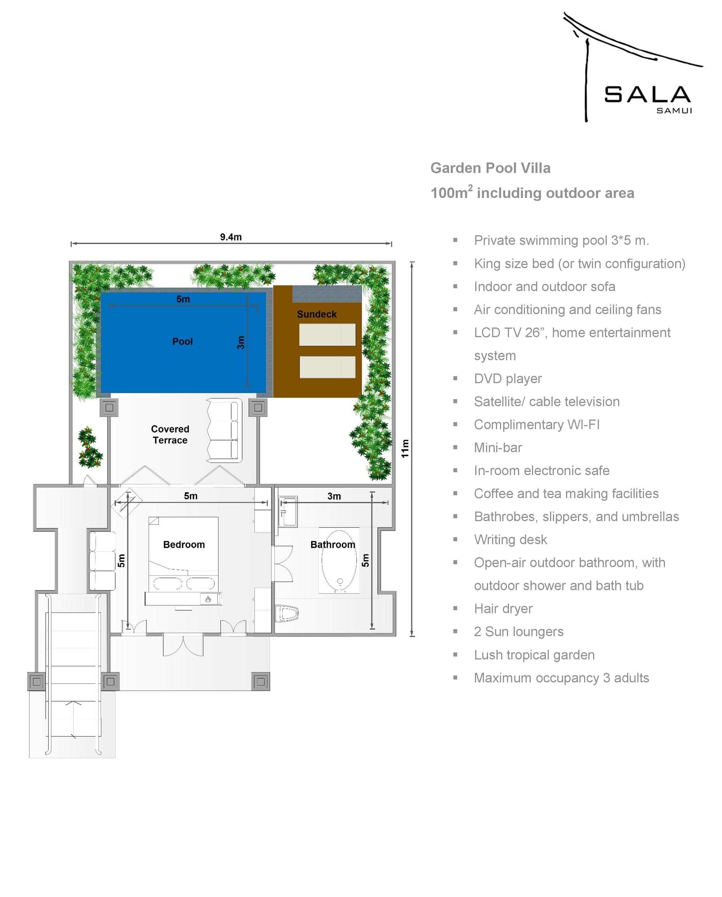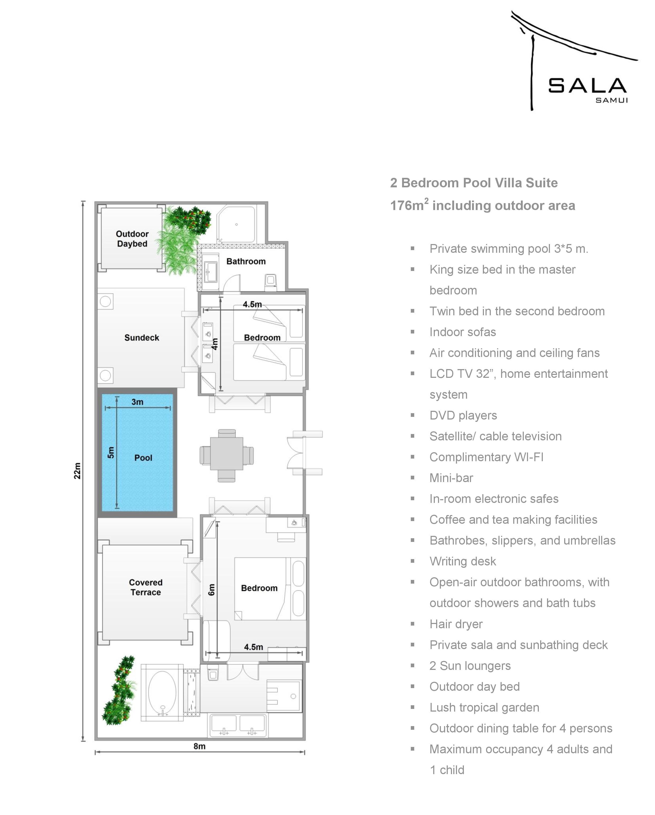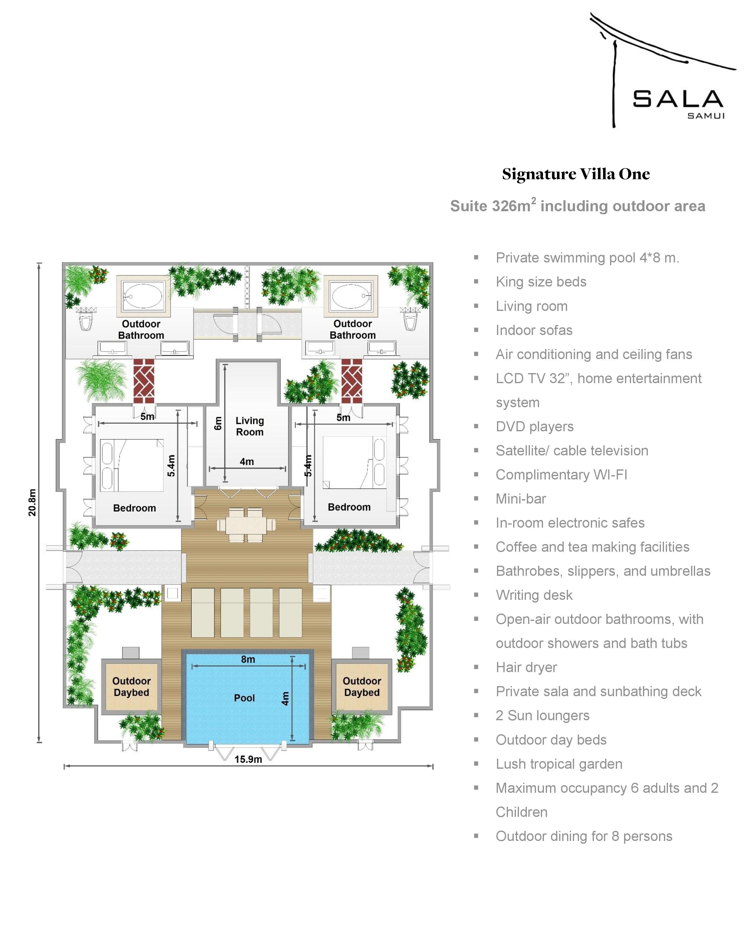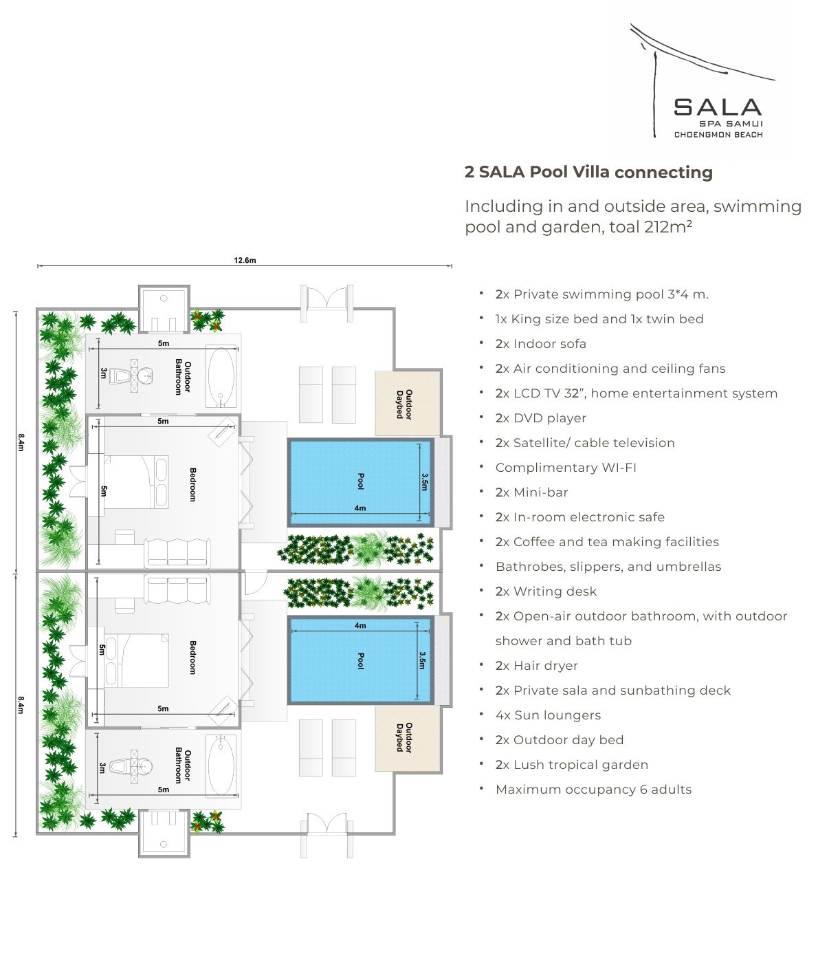 Номер состоит из 2-х расположенных рядом вилл Sala Pool Villa, соединенных дверью на террасе; для гостей: 2 спальни (25 м² каждая) с 1 двуспальной или 2-мя односпальными кроватями, 2 ванные комнаты (15 м²) с душем и ванной на свежем воздухе, 2 крытые террасы с кушеткой и обеденной зоной; 2 бассейна (12 м²), 2 террасы для загара, шезлонги, 2 беседки с кушеткой и столиком, 2 собственных сада, вид на сады; план номера;