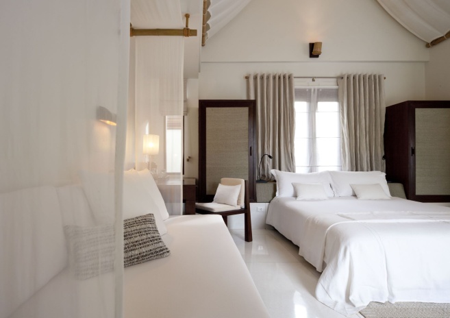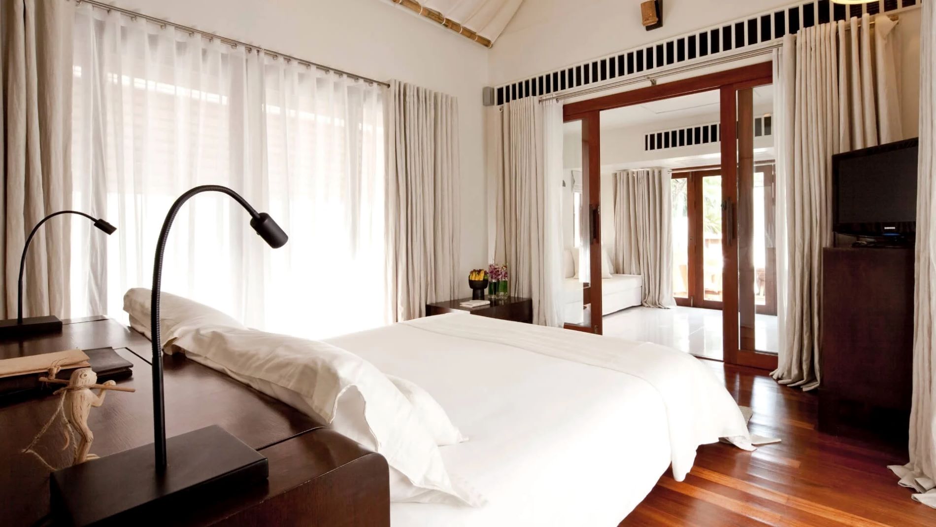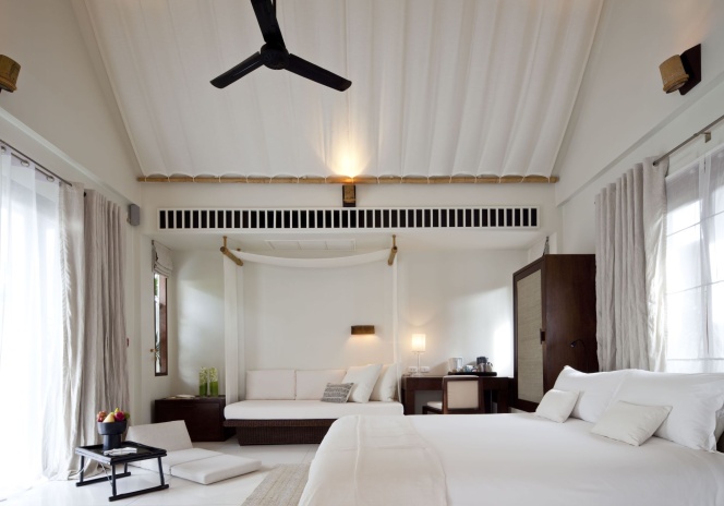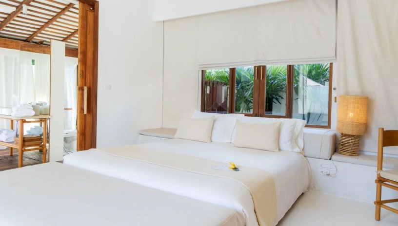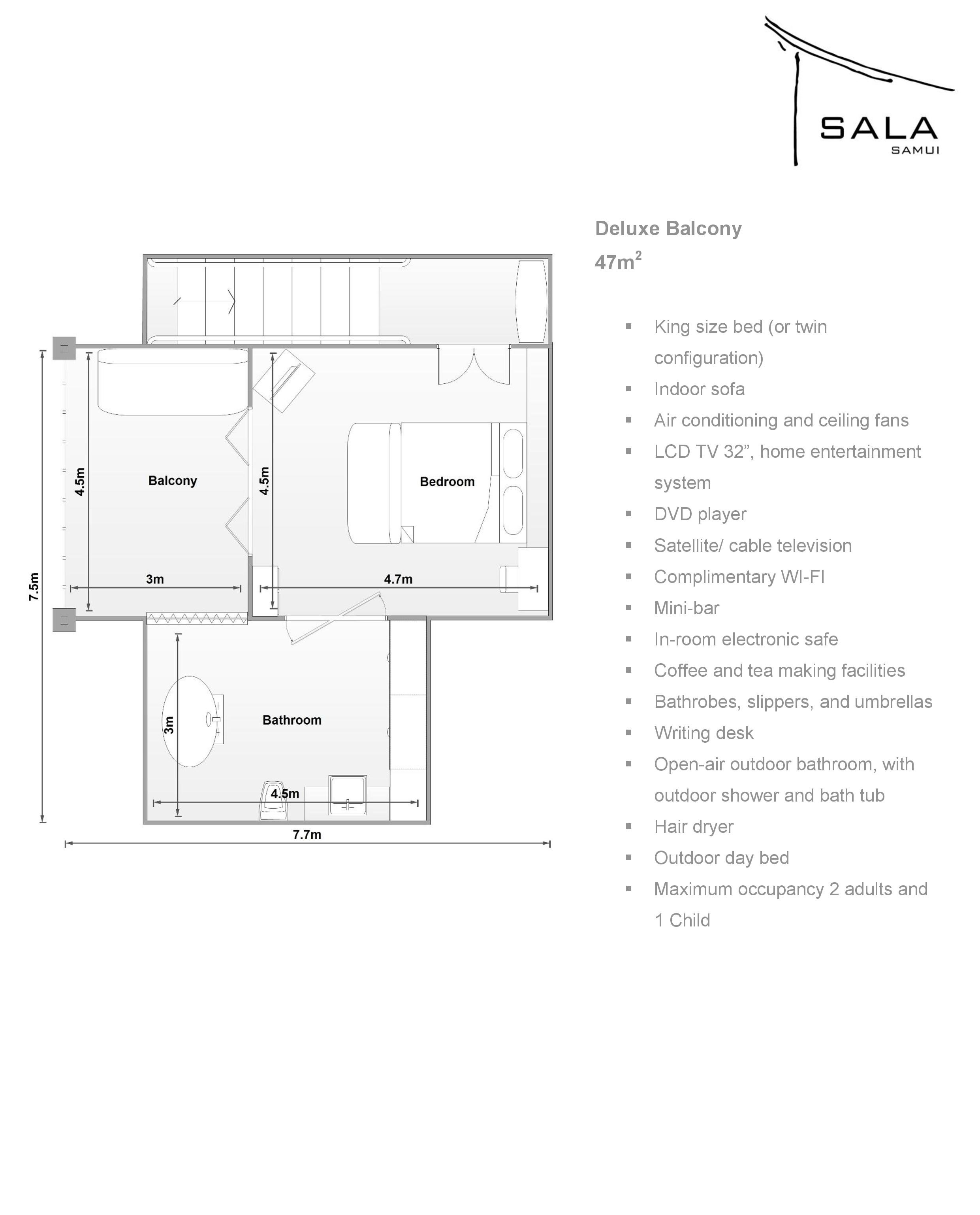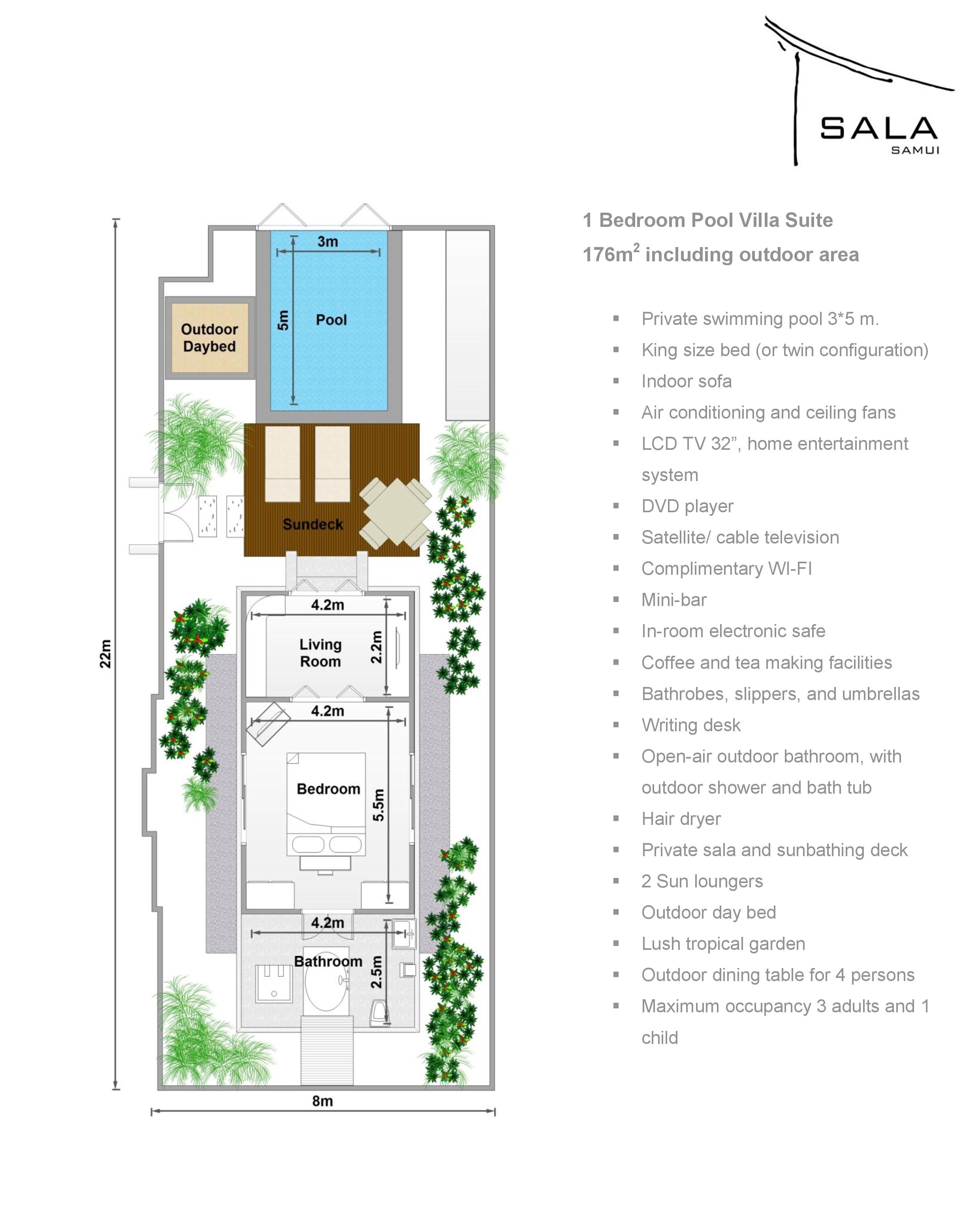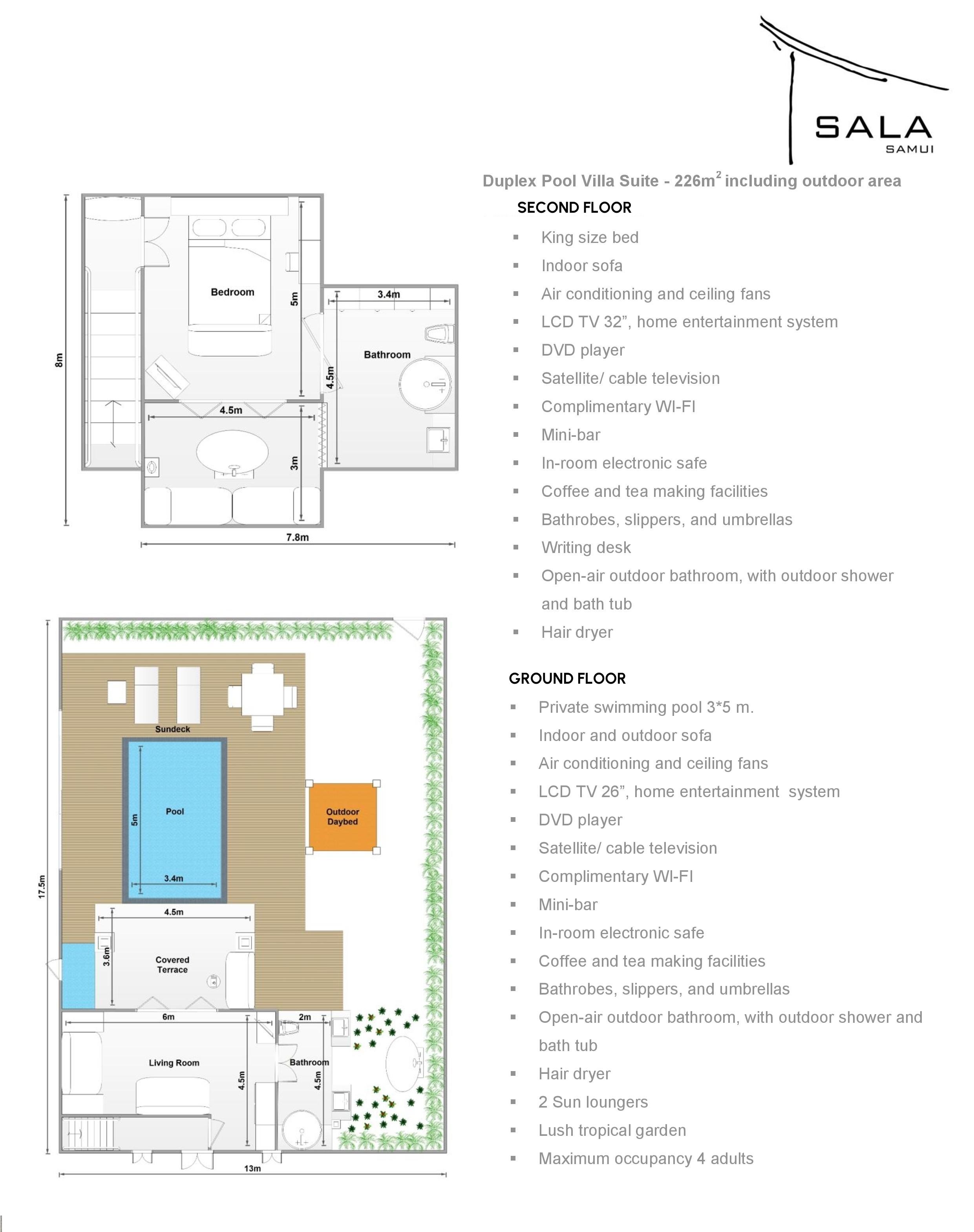 Номер состоит из 2-х расположенных рядом вилл Sala Pool Villa, соединенных дверью на террасе; для гостей: 2 спальни (25 м² каждая) с 1 двуспальной или 2-мя односпальными кроватями, 2 ванные комнаты (15 м²) с душем и ванной на свежем воздухе, 2 крытые террасы с кушеткой и обеденной зоной; 2 бассейна (12 м²), 2 террасы для загара, шезлонги, 2 беседки с кушеткой и столиком, 2 собственных сада, вид на сады; план номера;