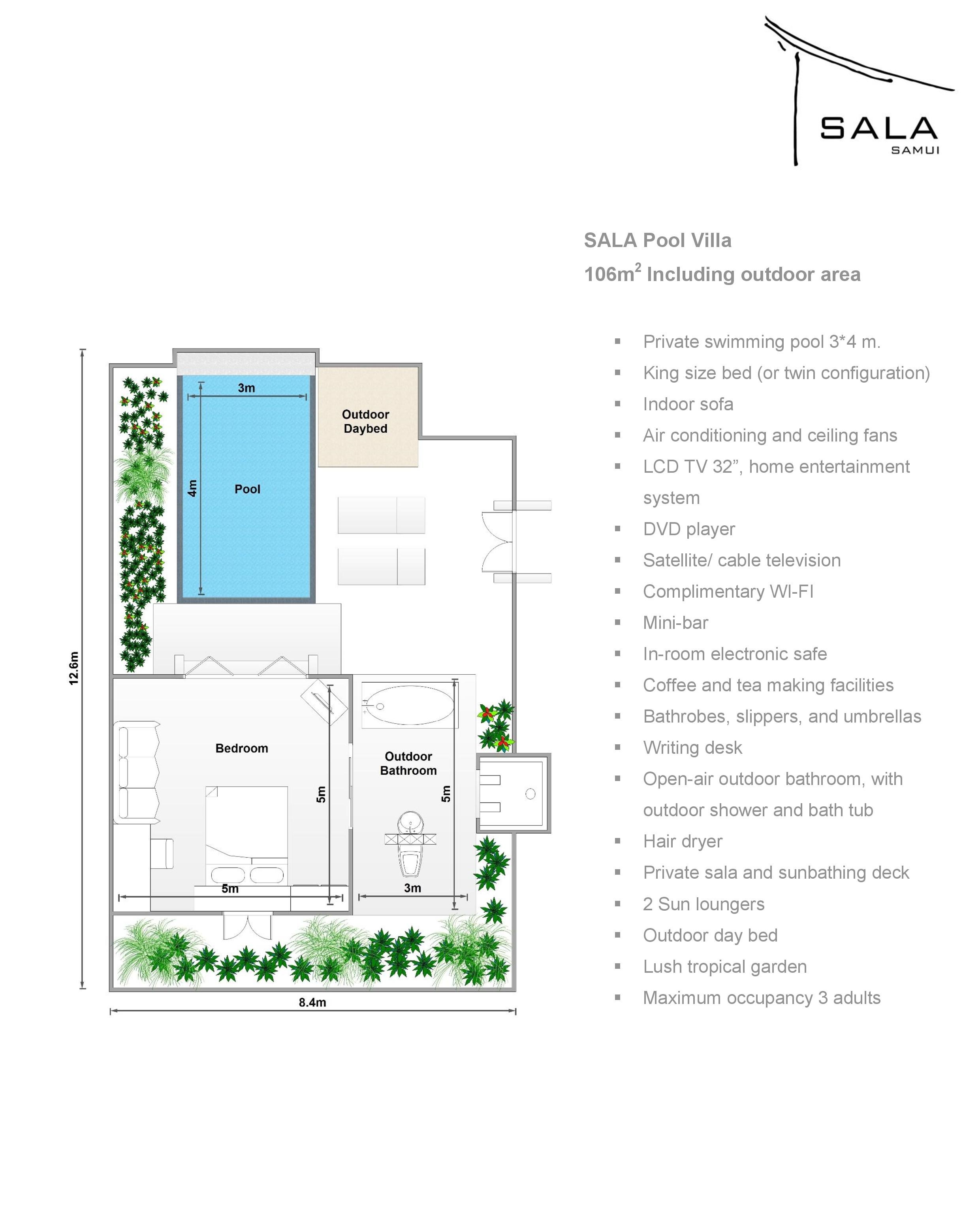 28 номеров Sala Pool Villa (106 м², макс. 3 чел.).
