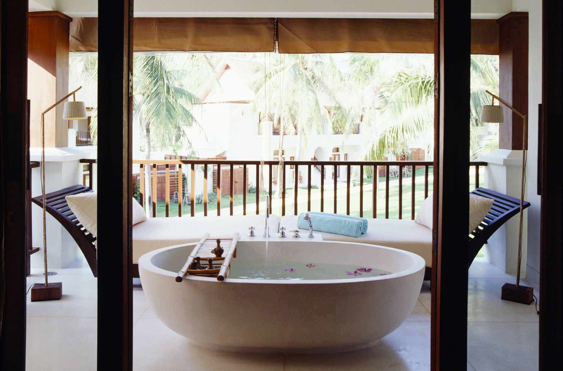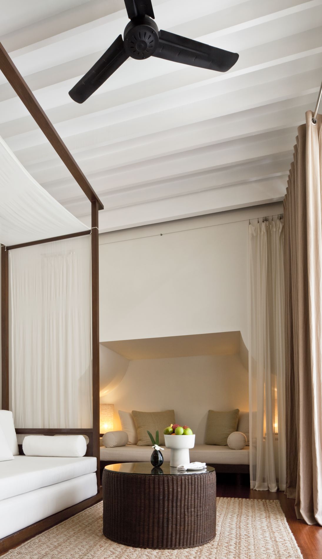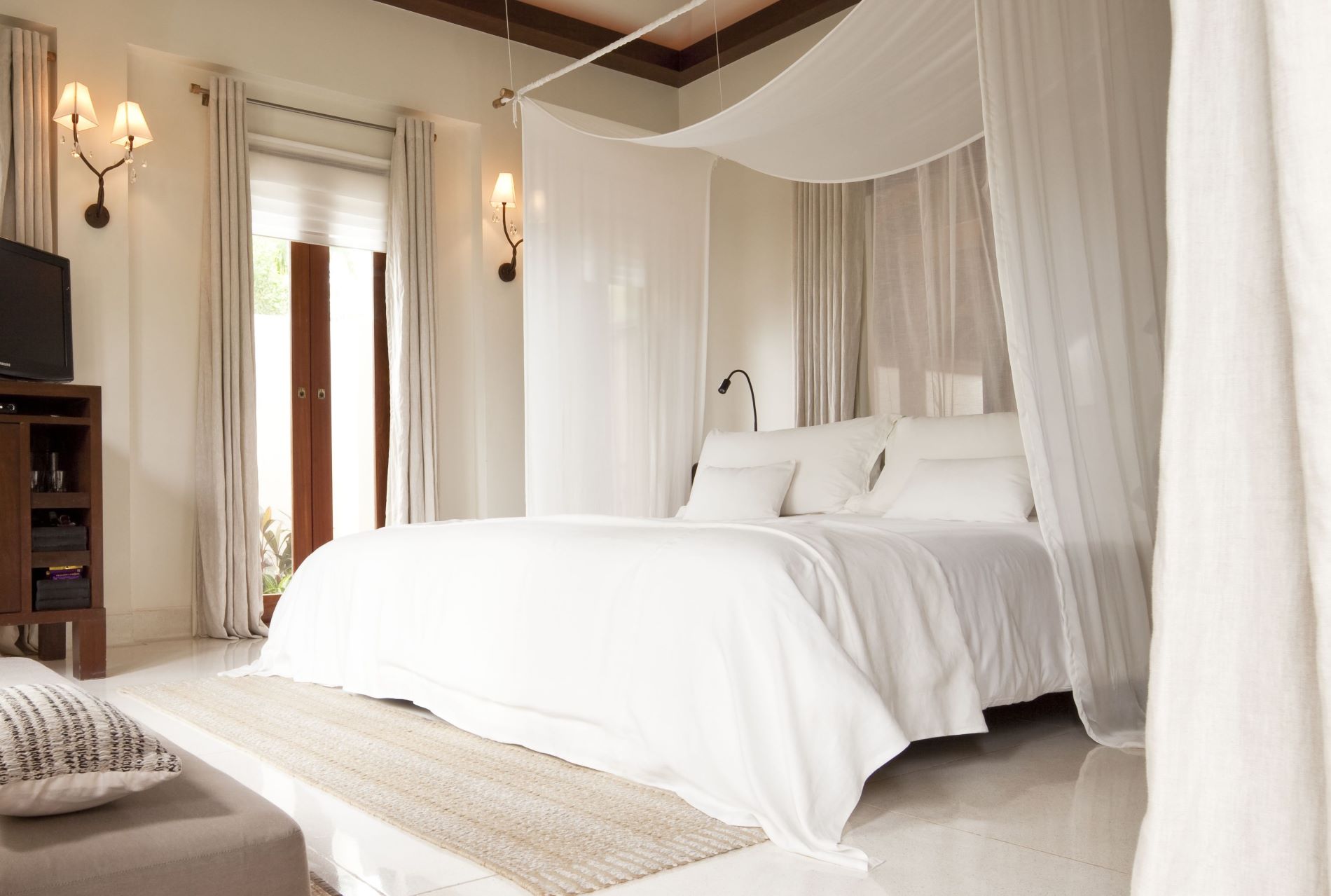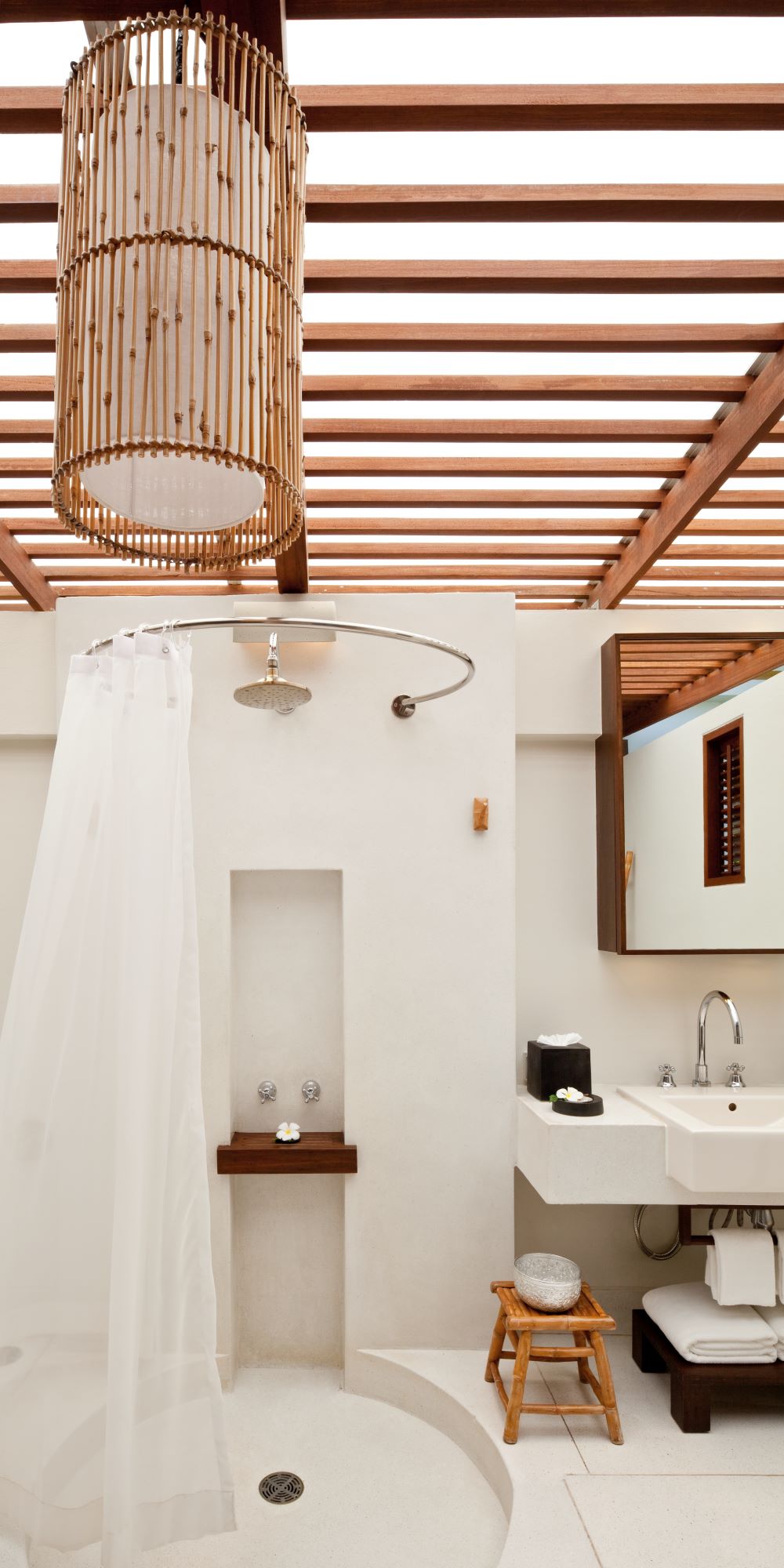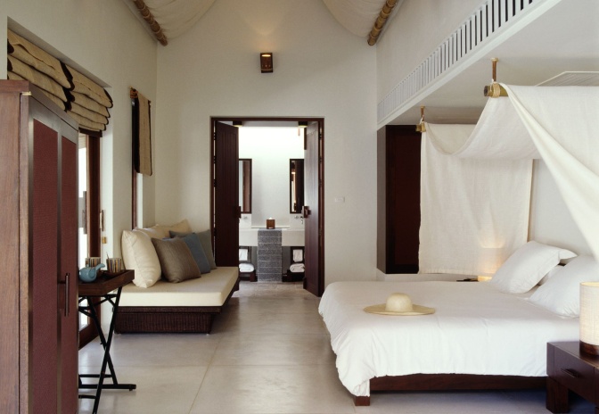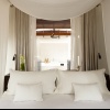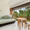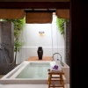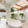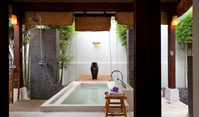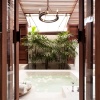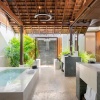 Отдельная вилла: спальня (25 м²) с 1-й двуспальной (20 номеров) или 2-мя односпальными кроватями (8 номеров), ванная комната (15 м²) с душем и ванной на свежем воздухе, крытая терраса с кушеткой и обеденной зоной на 2 персоны; патио с бассейном (12 м²), террасой для загара, шезлонгами, беседкой для отдыха с кушеткой, сад, вид на сад; план номера;