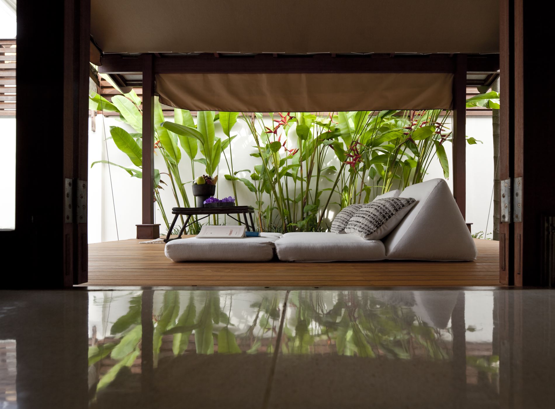 Отдельная двухэтажная вилла; верхний этаж: спальня (21 м²) с 1-й двуспальной кроватью, ванная комната (11 м²) с душем и выходом на балкон (13,5 м²) с кушеткой и ванной на свежем воздухе; нижний этаж: отдельная гостиная (20 м²) с диваном, ванная комната с душем и ванной на свежем воздухе (15 м²), крытая терраса с кушеткой (16 м²), патио с бассейном (17 м²), террасой для загара с шезлонгами, беседкой с кушеткой, обеденной зоной на 4 персоны, частный сад; вид на сад; план номера;