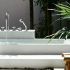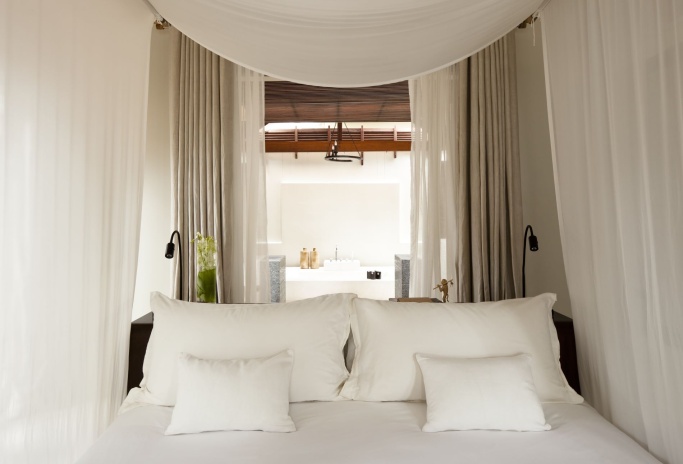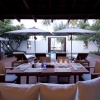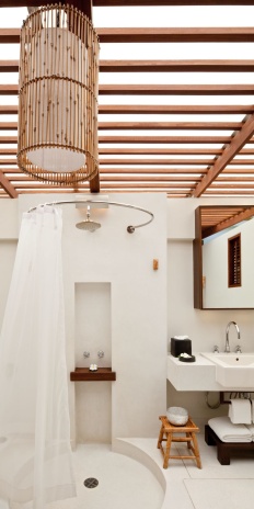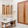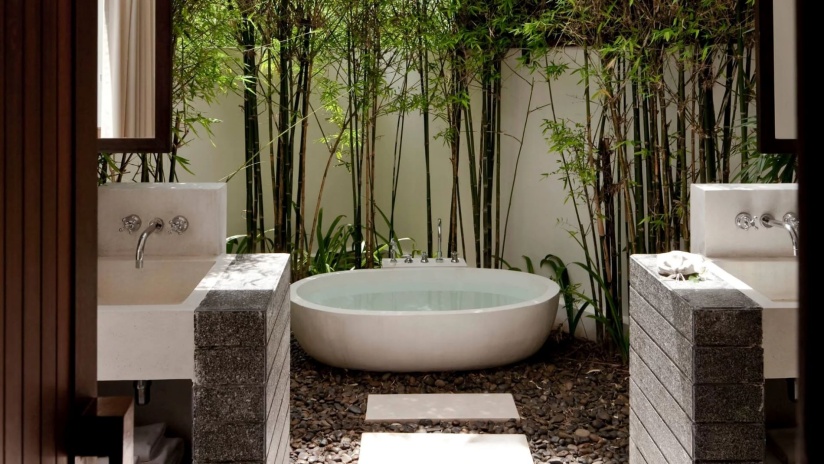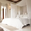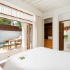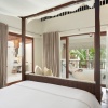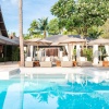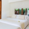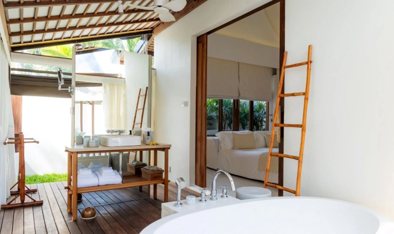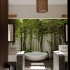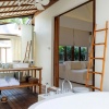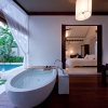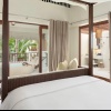 Вилла с 2-мя спальнями в отдельных павильонах: спальни (28 м² каждая) с двуспальными кроватями и собственными ванными комнатами (23 м² каждая) с душем и ванной на свежем воздухе, между спальнями – гостиная (24 м²) с кухонной зоной и выходом на патио: обеденная зона на 6 персон, бассейн (32 м²), терраса для загара с шезлонгами, 2 беседки с кушетками, частный сад; вид на сад; план номера;