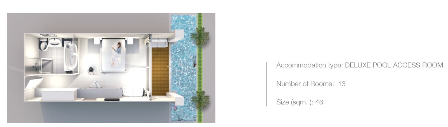 13 номеров Deluxe Pool Access (46 м², макс. 3 чел.).