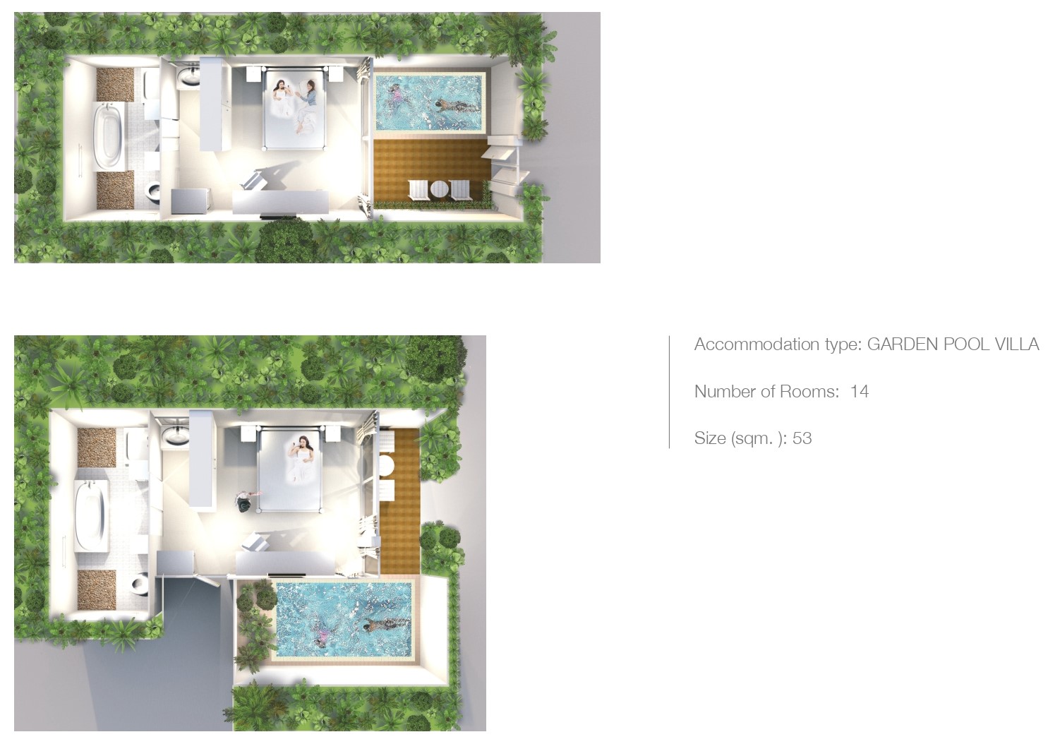 14 номеров Garden Pool Villa (53 м², макс. 3 чел.).