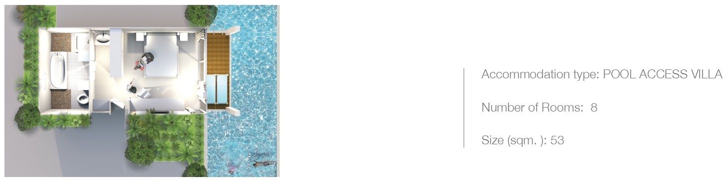8 номеров Pool Access Villa (53 м², макс. 3 чел.).