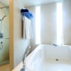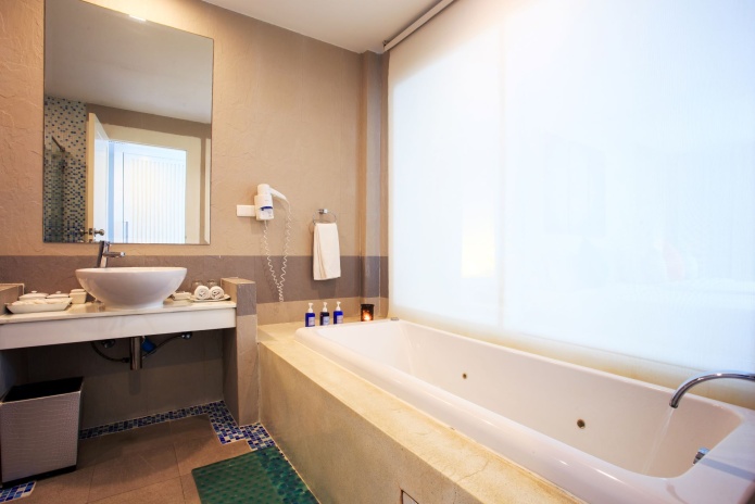 Номера на 1-м этаже трехэтажного корпуса: 1 двуспальная кровать king size или 1 двуспальная кровать king size + 1 односпальная кровать; отдельная ванная комната с ванной и душевой кабиной (отделена стеной с непрозрачным окном); меблированная терраса (9 м²) с кушеткой, спуск в открытый бассейн, расположенный вдоль корпуса; вид на главный бассейн; план номера;