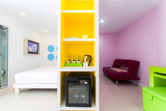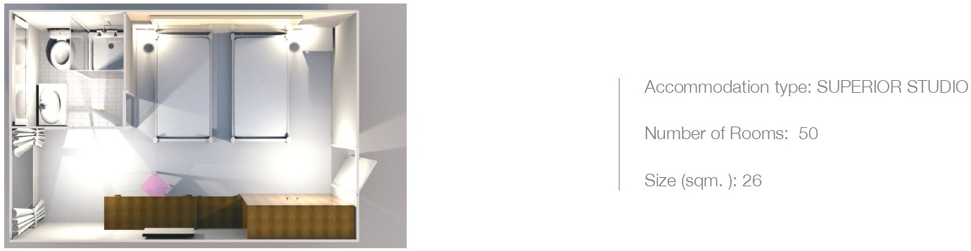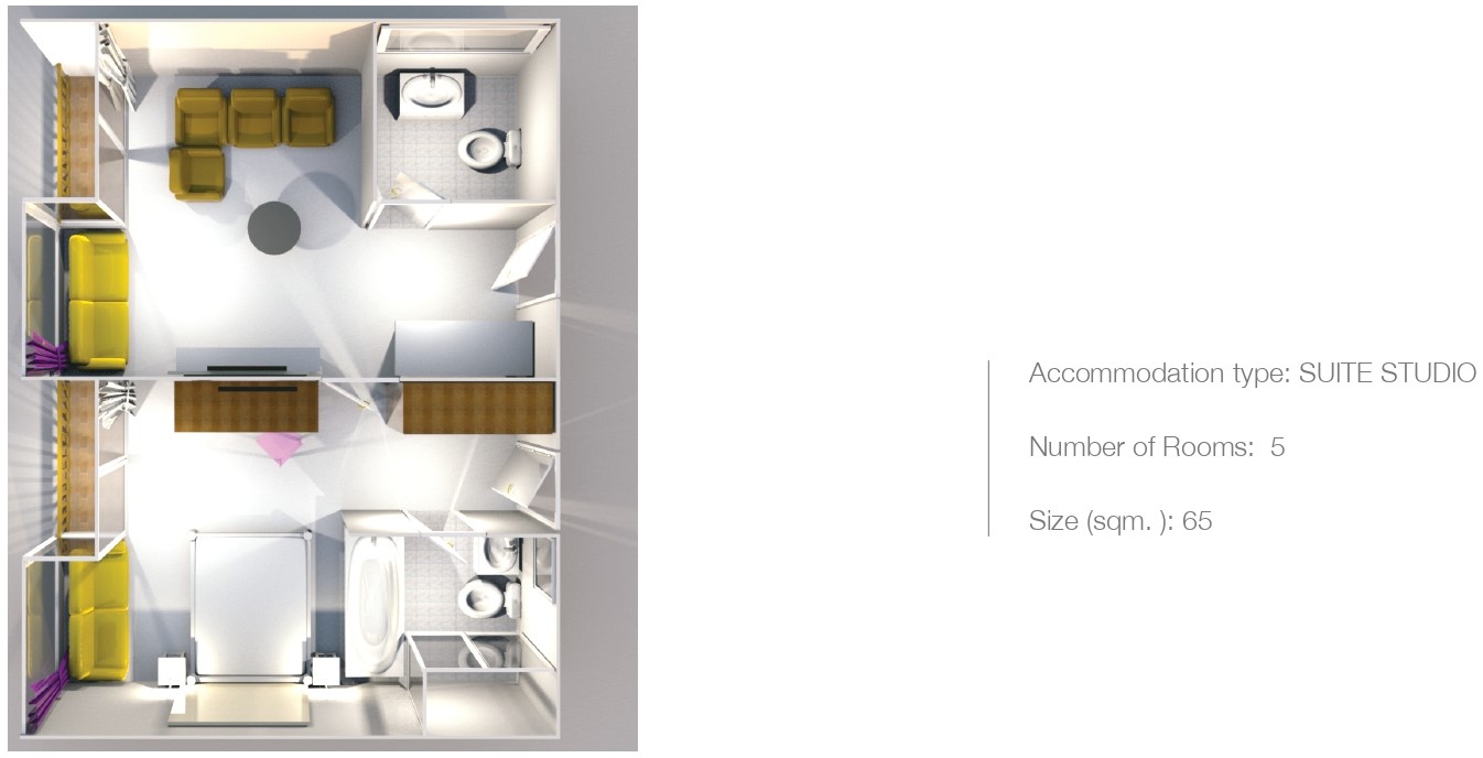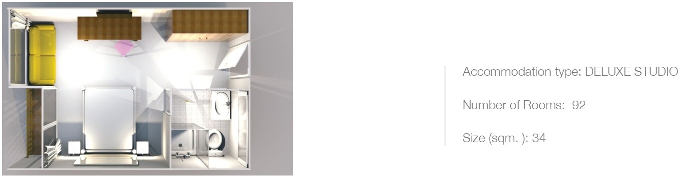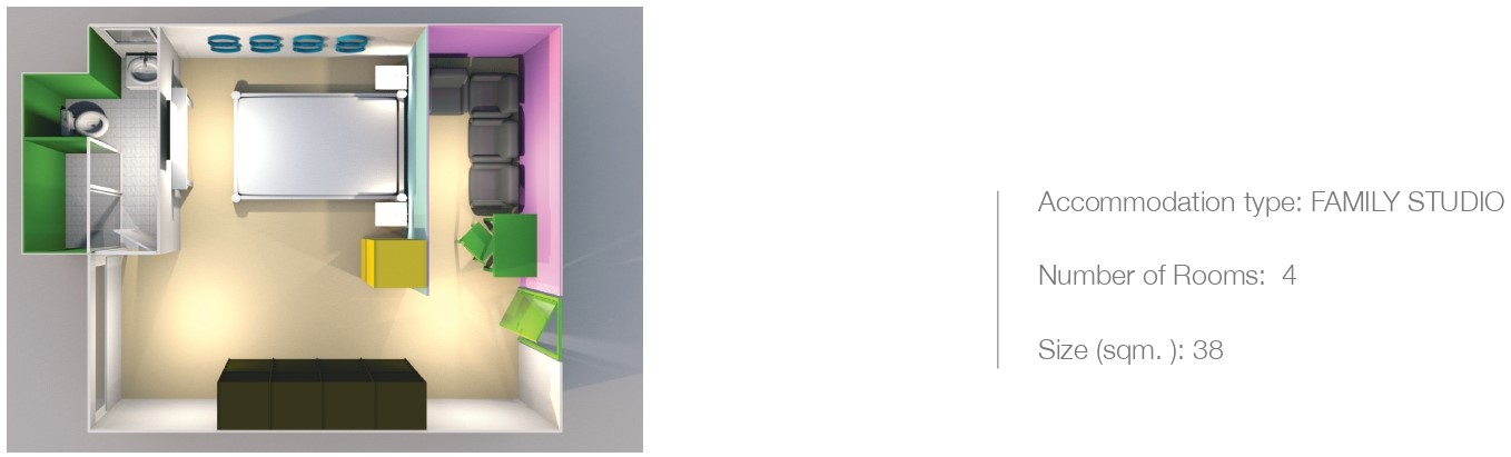 Гости размещаются в ярких и современных номерах-студиях и сьютах, большинство из которых имеют балкон; предусмотрены семейные варианты.
