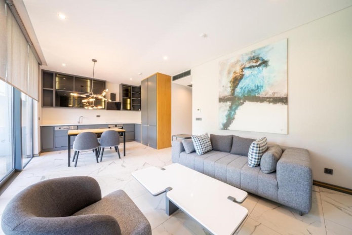 2 спальни с двуспальными кроватями, 1 ванная комната, 2 туалета, кухня (холодильник, посудомоечная машина, встроенная духовка), гостиная зона, балкон или терраса;