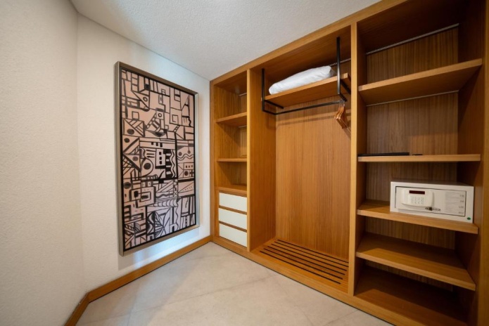 5 спален с двуспальной кроватью в каждой (3 спальни на верхнем этаже, 2 спальни на первом этаже), 5 ванных комнат, 6 туалетов, кухня (холодильник, посудомоечная машина, встроенная духовка), гостиная (гостиный уголок, обеденный стол), лифт, частный бассейн (55 м²), терраса, лежаки и зонтики, услуга «подготовки постели ко сну».