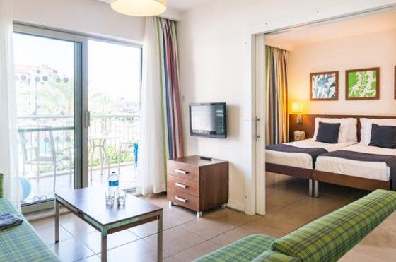 Small Family room - студии 33 м2. Две односпальные кровати + дополнительная кровать для 1 молодого/взрослого человека или 2 детей. На кухне есть микроволновая печка, холодильник, чайник, тостер и плита. Санузел, душ, фен для сушки волос. ТВ и телефон. Сейф за дополнительную оплату. Беспроводной Интернет (за дополнительную оплату). Уборка 5 дней в неделю, посуда не моется. Family room - 2-х комнатный апартамент, 38 м2. Две односпальные кровати. Дополнительное спальное место. На кухне есть микроволновая печка, холодильник, чайник, тостер и плита. Санузел, душ, фен для сушки волос. ТВ и телефон. Сейф за дополнительную оплату. Беспроводной Интернет (за дополнительную оплату). Уборка 5 дней в неделю, посуда не моется. Family room (на верхнем этаже) 2-х комнатная квартира, 49 м2. Две односпальные кровати. Дополнительное спальное место для двух человек. В некоторых квартирах могут быть добавлены до 3 дополнительных кроватей (1 взрослый человек или 2 ребенка). На кухне есть микроволновая печка, холодильник, чайник, тостер и плита. Санузел, душ, фен для сушки волос. ТВ и телефон. Уборка 5 дней в неделю, посуда не моется. Happy Baby - 2-х комнатный апартамент, 38 м2. Две односпальные кровати. Дополнительное спальное место для двух человек. На кухне есть микроволновая печка, холодильник, чайник, тостер и плита. Санузел, душ, фен для сушки волос. ТВ и телефон. В номерах этой категории представлены дополнительные возможности для семей с детьми: детская кровать, детский складной стол на колесиках, стульчик для детей, кресло для детей, емкость для детского питания, пуф для ребенка, вилка и ножик (гигиеничные, пластмассовые). Уборка и мытьё посуды каждый день. Шезлонги на террасе и ограждение по периметру террасы. Royal Family - 2-х комнатные апартаменты, 38 м2. Две односпальные кровати. Дополнительное спальное место для двух человек. На кухне есть микроволновая печка, холодильник, чайник, тостер и плита. Санузел, душ, фен для сушки волос. ТВ и телефон. Халаты, утюг и гладильный стол Шезлонги для принятия солнечных ванн на террасе/балконе. Пакет «добро пожаловать» с цветами, закусками, фруктами, вином. Пиво и легкие напитки. Уборка и мытьё посуды каждый день. Big Family - 3-х комнатный апартамент 46 м2. Гостиная и 2 спальни. В основной спальне две односпальные кровати, во второй спальне двухъярусная кровать и обычная кровать. Дополнительное спальное место. На кухне есть микроволновая печка, холодильник, чайник, тостер и плита. Санузел, душ, фен для сушки волос. ТВ и телефон. Уборка и мытьё посуды каждый день. - кондиционер; - кабельное ТВ; - Wi-Fi Интернет (за дополнительную оплату); - телефон; - кухня: плита, микроволновая печь, тостер, чайник, тостер, холодильник; - сейф (за дополнительную оплату). - ванная комната; - фен.