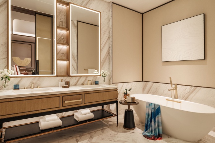 На 2 – 12 этажах, спальня с двуспальной кроватью king-size, гостиная комната с диваном, гардеробная, ванная комната с ванной и душем, терраса, вид на залив, услуги батлера, эксклюзивный доступ в Iliana Pool Club, см. план номера;