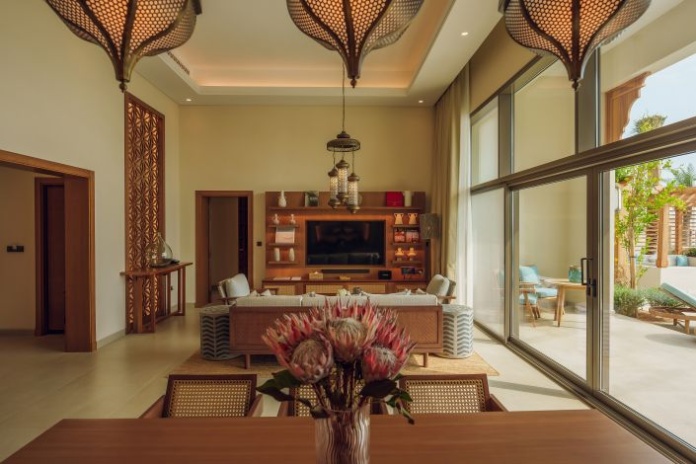 Кулинарная концепция включает ресторан Aseelah с блюдами из морепродуктов и мяса на углях, Nafourah Lounge с арабским кофе и мятным чаем и Amara Bar у бассейна. Доступен приватный ужин на вилле.