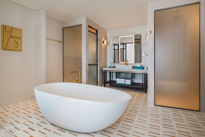 Двуспальная кровать king-size, гостиная зона с диваном, ванная комната с ванной и душем, балкон;