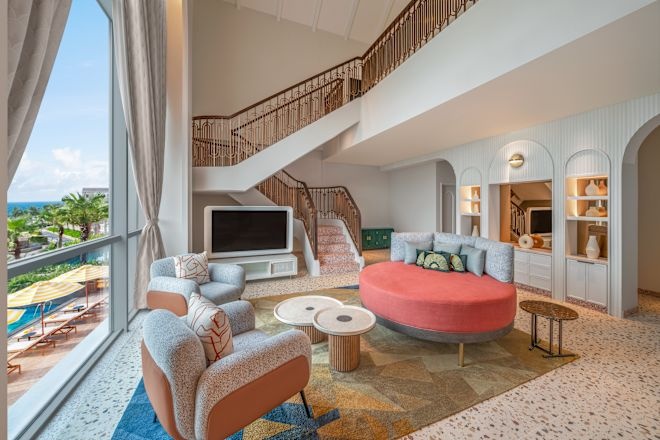 Двухуровневый номер, спальня с двуспальной кроватью king-size, гостиная комната с диваном, ванная комната с душем, балкон, вид на океан;