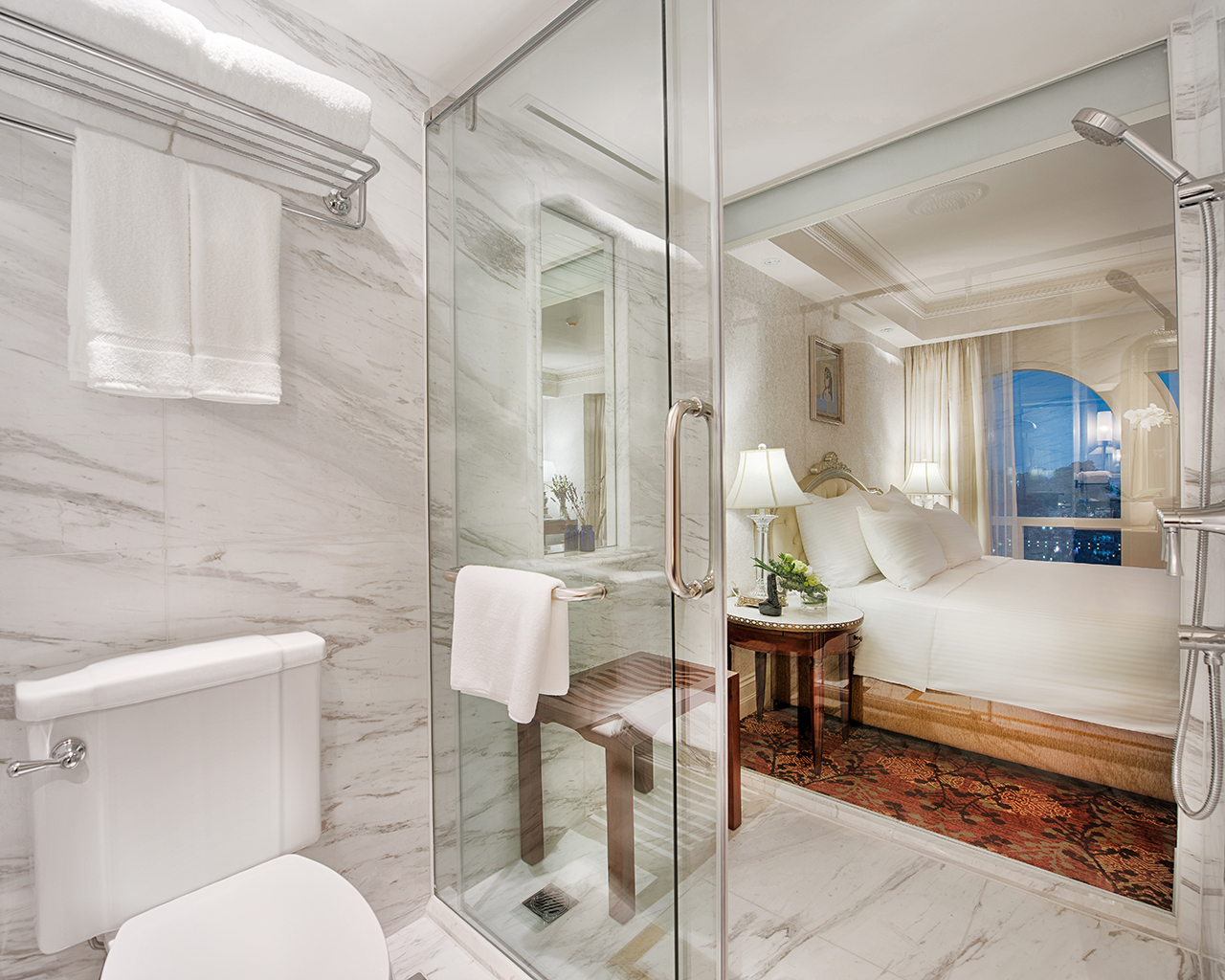 Номер с двуспальной кроватью, отдельная ванная комната с душевой кабиной и стеклянной стеной со шторой; вид на город;